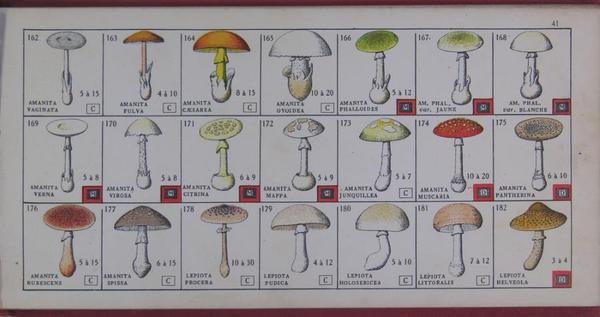 Edition des arts graphiques modernes, Nancy 1926. In/8 à l’italienne reliure éditeur toile simili chagrin rouge, 124 p. - 10 figures et 307 dessins exécutés à la plume et coloriés par l’auteur planches en chromolithographies. Petits trous sur le dos. Livre de poche de l’amateur contenant tout ce qu’il faut savoir pour cueillir des champignons et en manger sans crainte d’empoisonnement, assez scientifique pour mermettre de classer tous les champignons que l’on peut rencontrer et assez simple pour ne citer ques les espèces qui sont intéressantes, soit par leur comestibilité, soit par leur toxicité, soit par leur abondance.