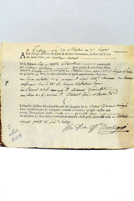 A ETE CHARGE. au Port de cette ville. sur le Batiment Poste appéllé 'Le Républicain'. pour porter et conduire à BASTIA. les marchandises ci-après mentionnées.