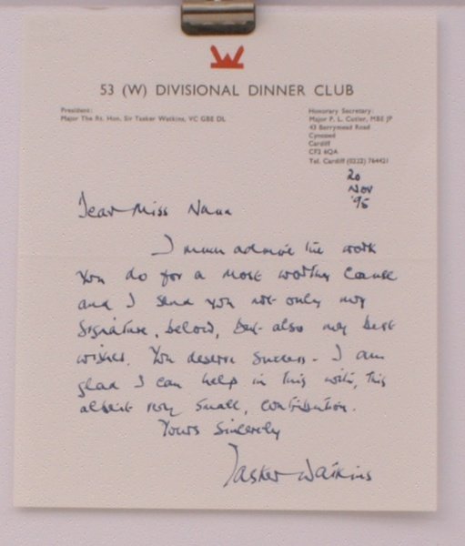 Single sheet measuring 8.0 x 6.5 ins (approx. 20.0 x 17.0 cms), on stationery of 53 (W) Divisional Dinner Club printed in red and black, and dated 20 November 1995; near fine state. THE LETTER IS WRITTEN, DATED AND SIGNED ENTIRELY IN SIR TASKER'S HAND, AND IS SOLD WITH A BRIEF RESUME OF HIS POST-WAR CAREER AND A POOR QUALITY PHOTOGRAPHIC PORTRAIT. Sir Tasker Watkins was gazetted for the Victoria Cross on 2 November 1944. The citation reads: 'On 16 August 1944 at Barfour, Normandy, Lieutenant Watkins' company came under murderous machine-gun fire while advancing through corn fields set with booby traps. The only officer left, Lieutenant Watkins led a bayonet charge with his 30 remaining men against 50 enemy infantry, practically wiping them out. Finally, at dusk, separated from the rest of the battalion, he ordered his men to scatter and after he had personally charged and silenced an enemy machine-gun post, he brought them back to safety. His superb leadership not only saved his men, but decisively influenced the course of the battle'. Sir Tasker Watkins (1918-2007) was commissioned into the Welch Regiment in 1941 and was the first Welshman to win the Victoria Cross in WWII. He retired from the Army as a major in 1946 and entered the law. He was called to the bar in 1948 at the beginning of a distinguished legal career that culminated in his serving as Deputy Chief Justice of England from 1988-1993. He was knighted in 1971 and appointed a CBE in 1990. Watkins was President of the 53 (W) Divisional Dinner Club.