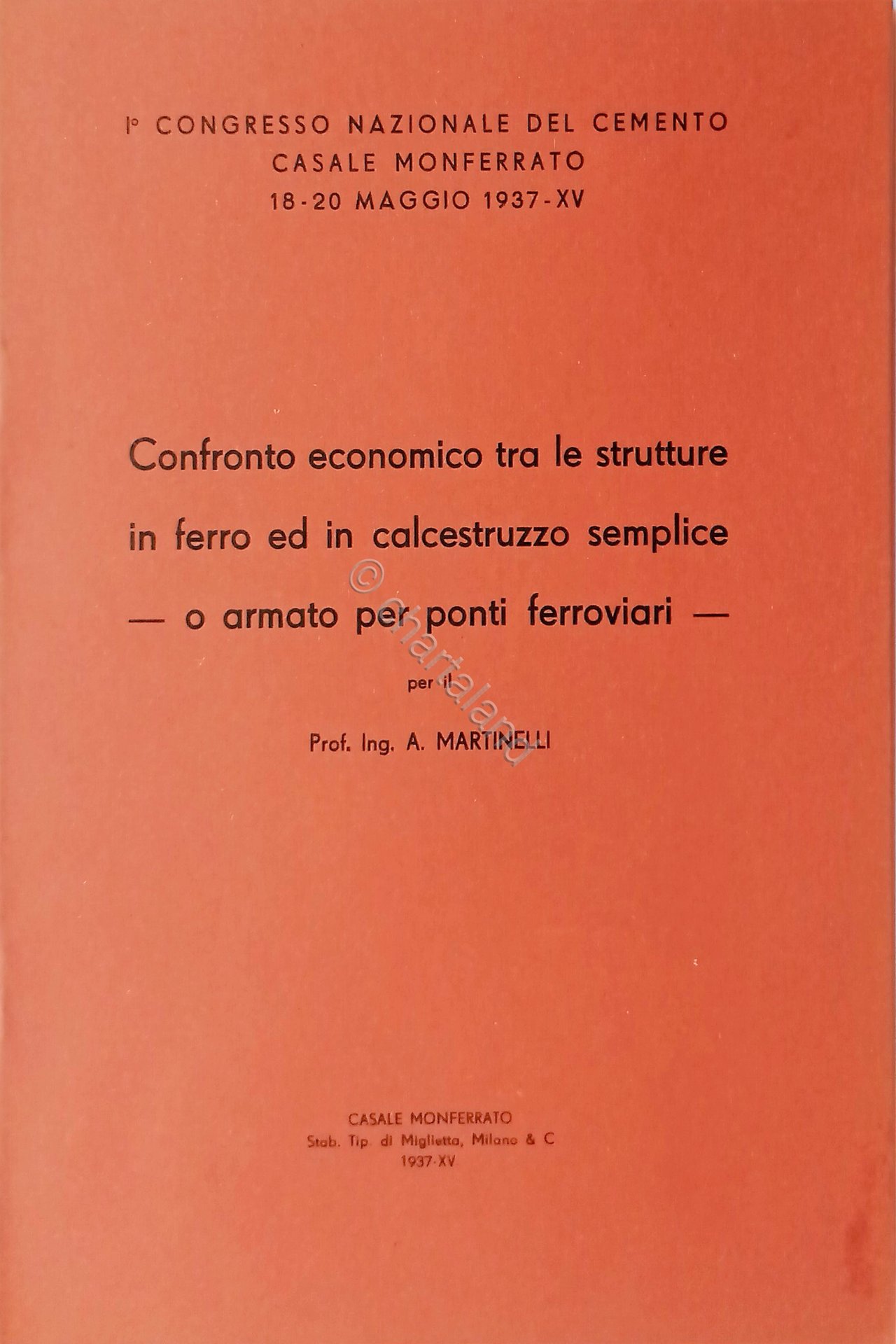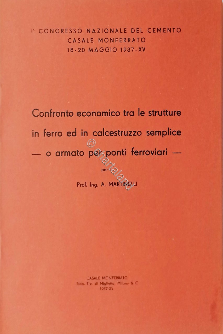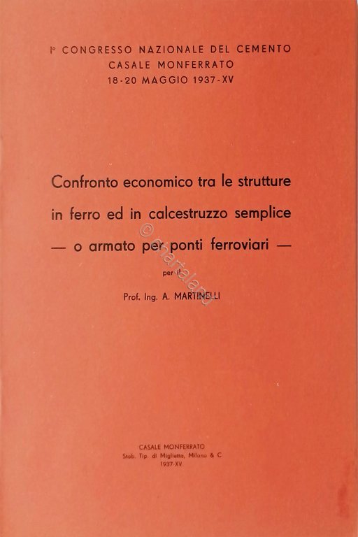 A. Martinelli - Confronto economico tra le strutture in ferro ed in calcestruzzo semplice o armato per Ponti ferroviari - ed. 1937 Testo in lingua italiana. Pagine 24 Copertina morbida. Condizioni molto boune.