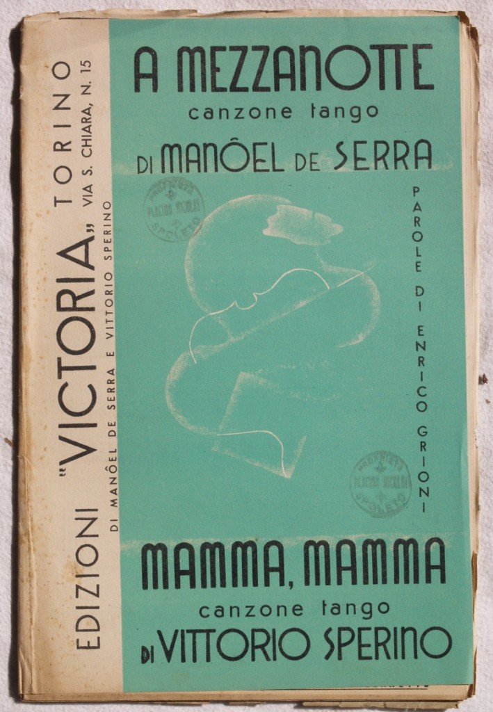 In 8. cm 26,5x18,5. pp 25. partitura completa per orchestra senza data ma degli anni '30 di due canzoni.<BR>Caratteristica copertina illustrata. Ex libris sulla copertina ed in qualche pagina. Ottime condizioni. a complete score for orchestra of 1930's.<BR>Carachteristic decorated cover of that period. Ex libris in the cover and in some pages. Very good conditions