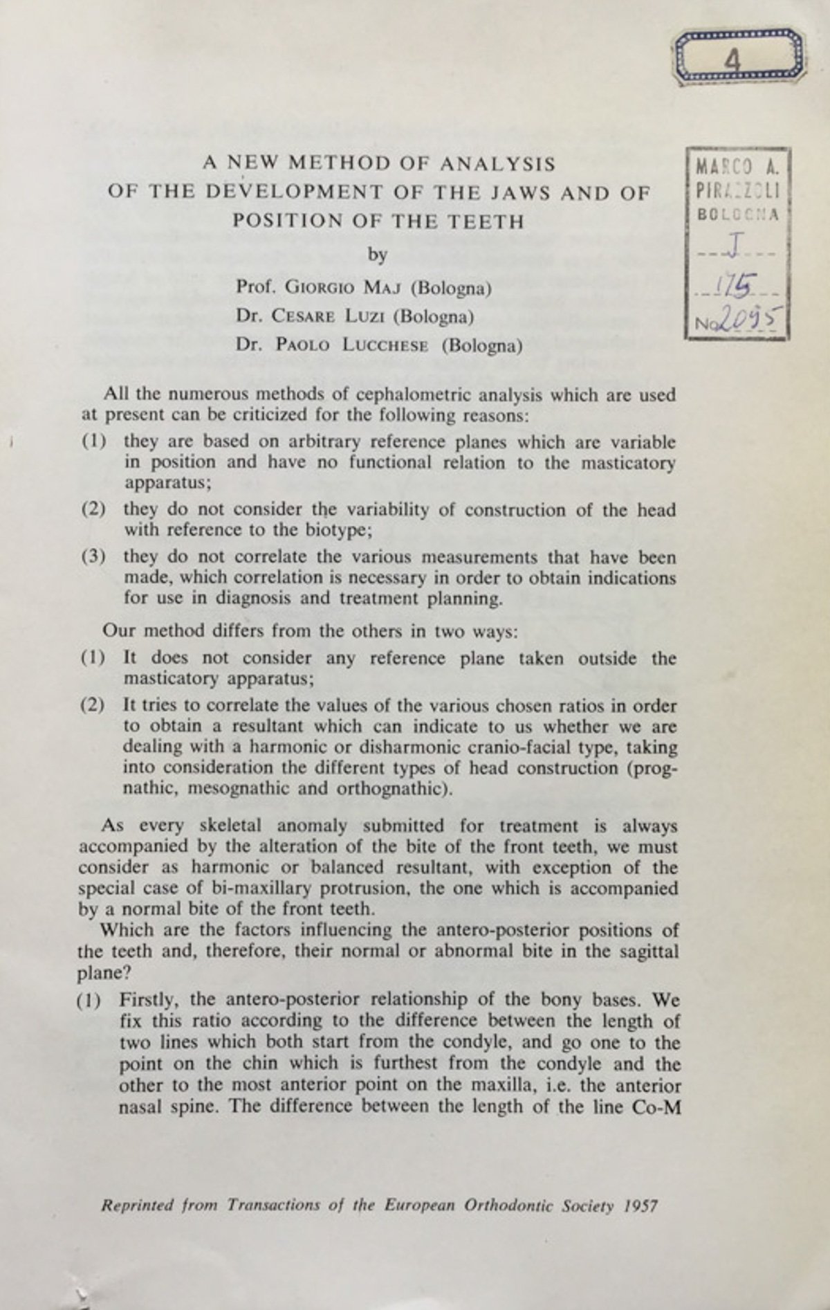 Reprinted from the 1957 Transaction of the European Orthodontic Society. Fascicolo, 15 pagine, in 8vo, ill.. 610 - Ba In Ottavi (15-23cm ) Ottimo (Fine) Ottimo