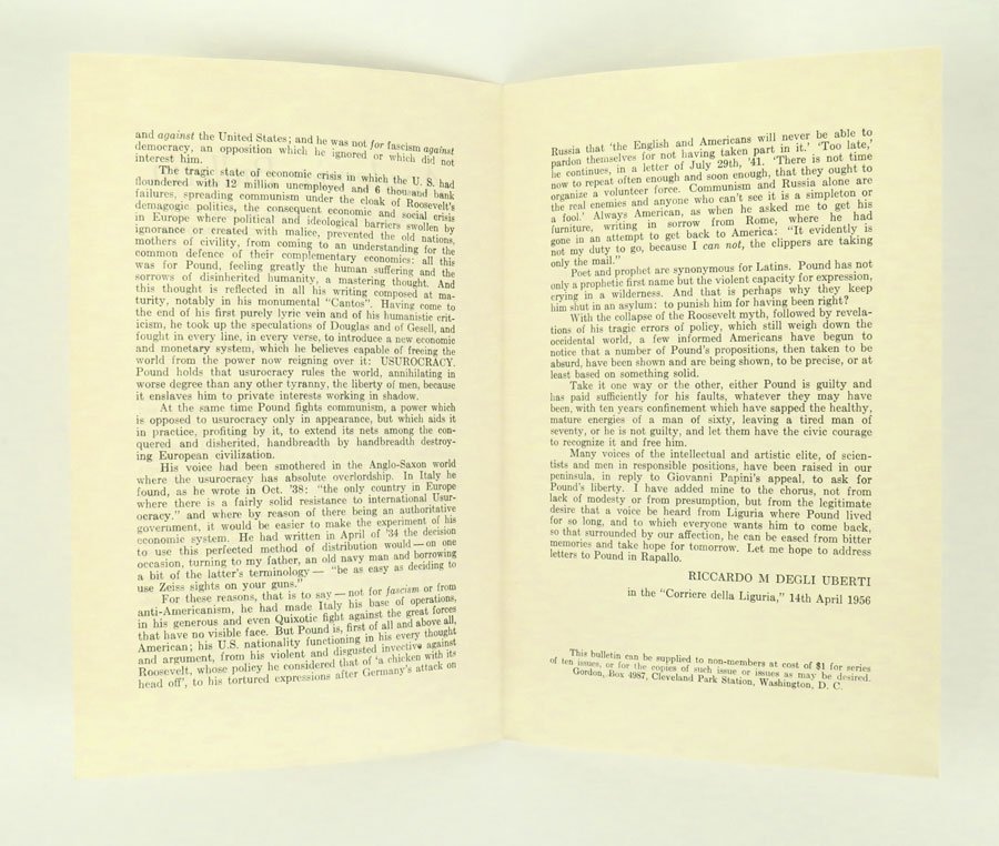 LIBROPrima edizione in inglese.Ottimo esemplare.Rarissima stampa indipendente la traduzione in inglese di un articolo pressoché ignoto alle bibliografie, pubblicato per la prima volta in italiano sul “Corriere della Liguria” il 14 aprile 1956 e poi ripubblicato, sempre in inglese, nello stesso 1956 in coda alla versione di Pound delle «Trachinie» di Sofocle.Gallup, Ezra Pound: a Bibliography, A72.