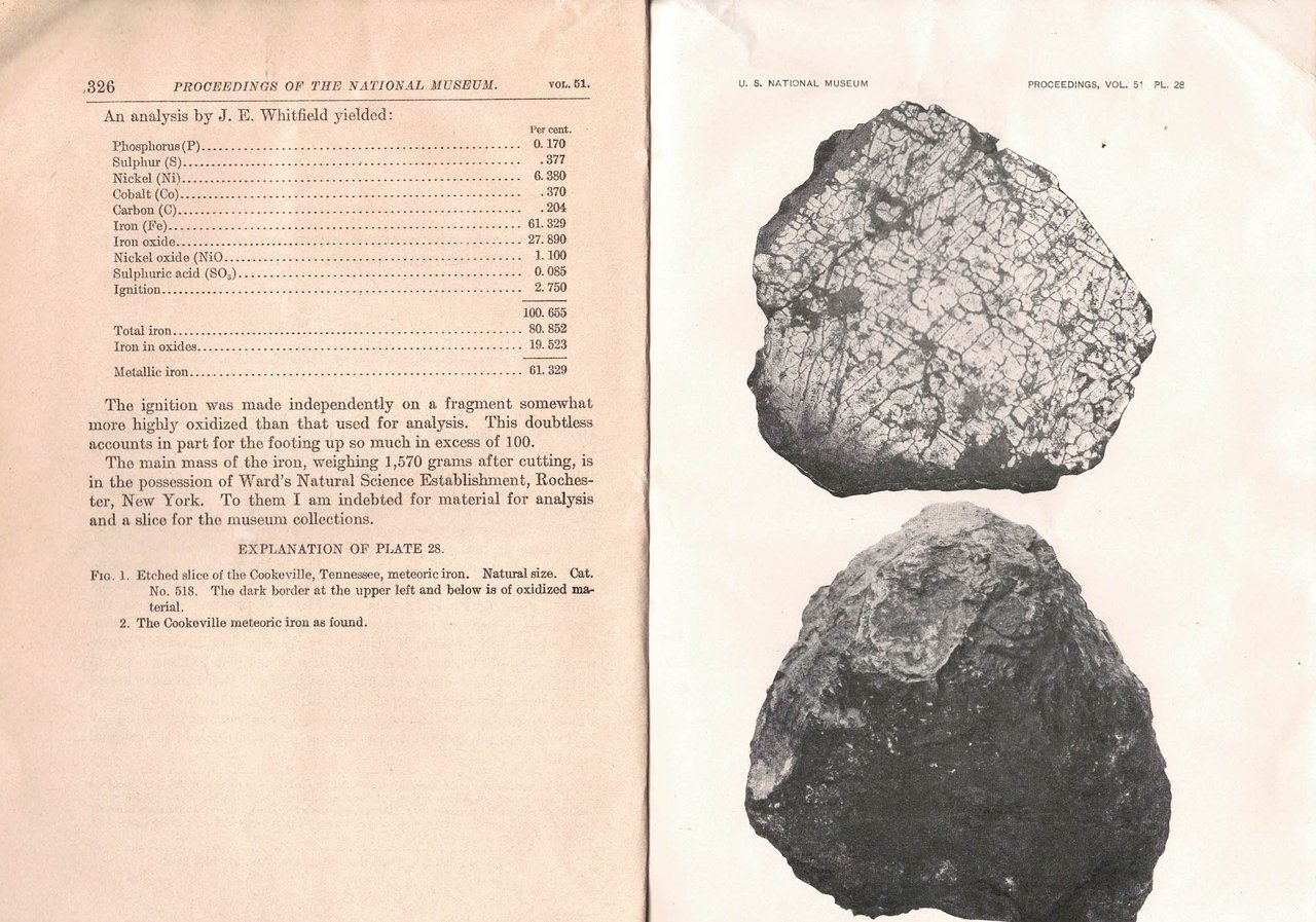 A recently found Iron meteorite from Cookeville, Putnam County, Tennessee. N. 2153 - From te Proceeding of the United States National Museum, Vol. 51, pp. 325-326, with plate 28.