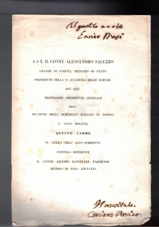 A s: E. Il Conte Alessandro Saluzzo grande di corona, ministro di stato, presidente della R. Accademia delle Scienze ecc. ecc. Meritissimo presidente generle della riunione degli scienziati italiani in Torino. L'anno 1840 quato carme in grazia del Conte Jacopo Sanvitale parmense.