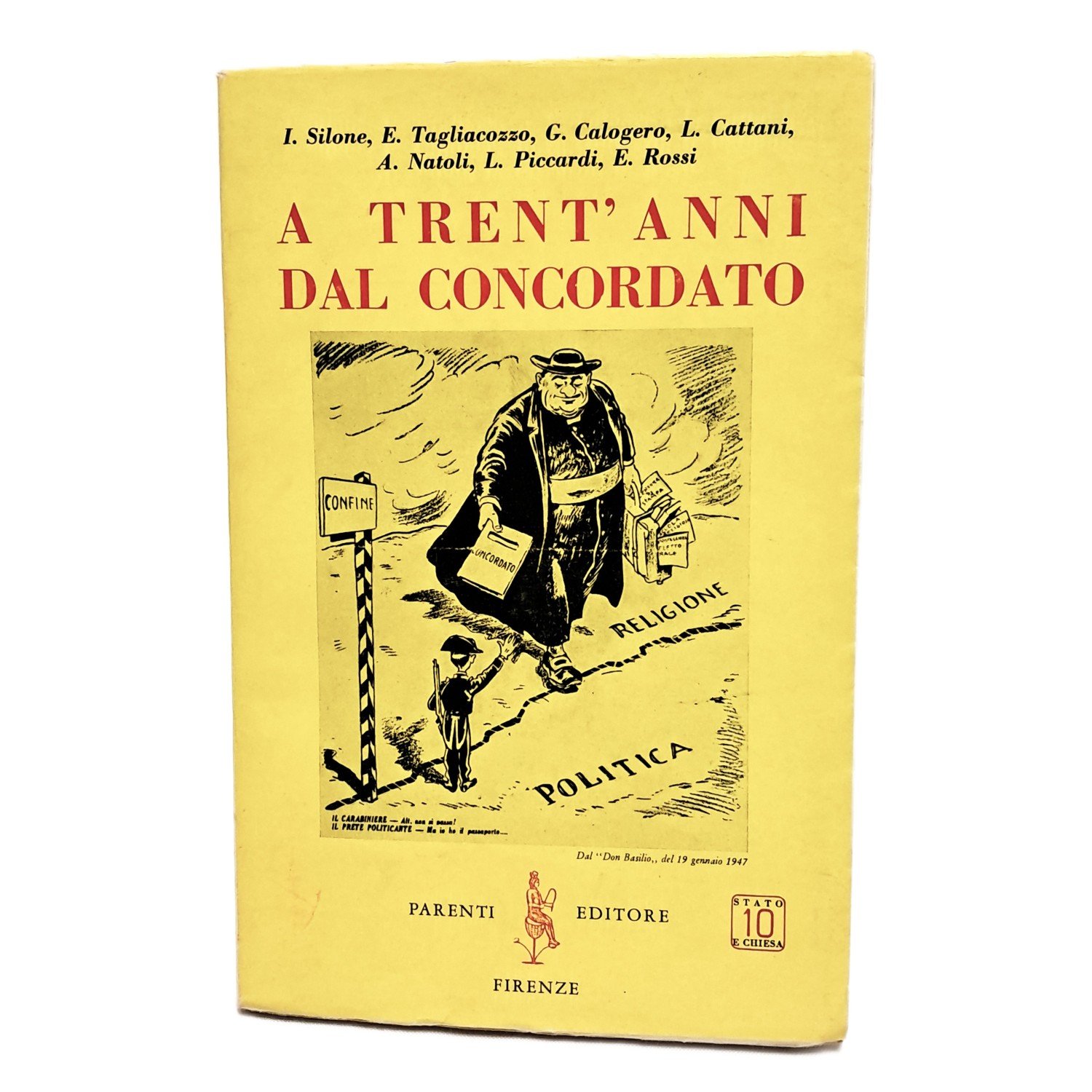 PRIMA EDIZIONE, collana Stato e Chiesa numero X Ignazio Silone presenta in questo libro i discorsi pronunciati da Tagliacozzo, Calogero e Cattani alla riunione degli amici del mondo tenuta il 19 aprile 1959 al Teatro Eliseo di Roma in occasione del trentennale della firma del concordato tra stato e chiesa. In brossura con sovraccoperta illustrata. Pp. 238. Intonso ottime condizioni.