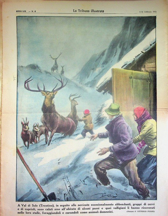 A Val di Sole (Trentino) in seguito alle nevicate eccezionalmente abbondanti, gruppi di cervi e di caprioli, sono calati sino all'abitato di alcuni paesi e qui valligiani li hanno ricoverati nello loro stalle, foraggiandoli e curandoli come animali domestici.