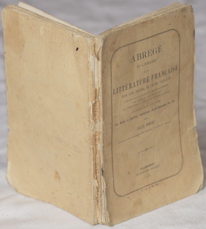 In 8. Dim. 19x12,5 cm. Pp. IV+71+IV+58. Interessante volume del 1875 di questo sunto della storia della letteratura francese scritto da Felix Sodini. Nella prima parte storia della letteratura francese dalle origini della letteratura francese fino al XIX secolo con indicazioni su maggiori scrittori. Alla fine tabella cronologica degli scrittori citati nell'opera e raccolta dei testi classici in prosa e in poesia. Testo scolastico ad uso degli studenti del secondo e terzo anno delle scuole e istituti tecnici e scuole normali. Brossura editoriale originale. In discrete condizioni. Copertina editoriale in discrete condizioni generali con usure e parti mancanti ai margini e dorso. Legatura in discrete condizioni con rotture. All'interno le pagine si presentano in buone condizioni con rare fioriture. Interesting volume of 1875 of this resuming of the history of french litterature written by Felix Sodini. In the first part history of french litterature from origins of french litterature until the XIX century with indications about the main writers. At the end chronological part of writers cited in the work and collection of classical texts in prose and poetry. School text for the usage of students of second and third year of technical schools and normal schools Editorial original cover. In fair conditions. Editorial cover in fair general conditions with wearings and missing parts in the edges and spine. Binding in fair conditions with cracks. Inside pages are in good conditions with occasional foxings.