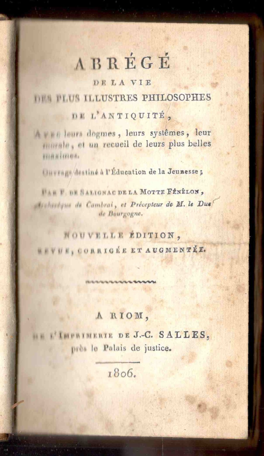 Abrégé de la Vie des plus illustres philosophes de l'Antiquité, avec leurs dogmes, leurs systèmes, leur morale, et un recueil de leurs plus belles Maximes | Libri antichi e moderni | Fenelon, François Salignac De La Mothe De