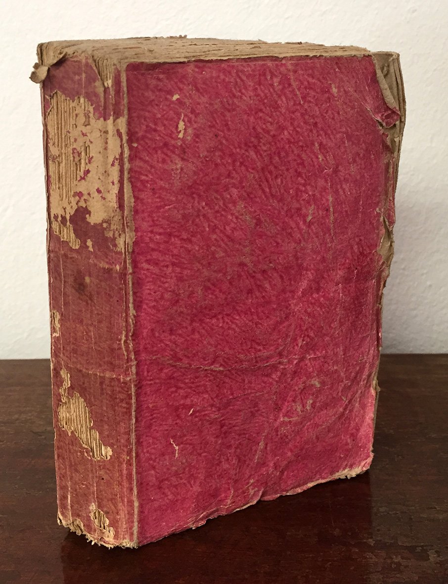 In 16mo (mm 140x89); pp. X, 299, [1]. Lievi fioriture diffuse, alcune carte un po' brunite. Legatura originale in carta rosa. Piccole mancanze al dorso e ai piatti. Bella copia in barbe.