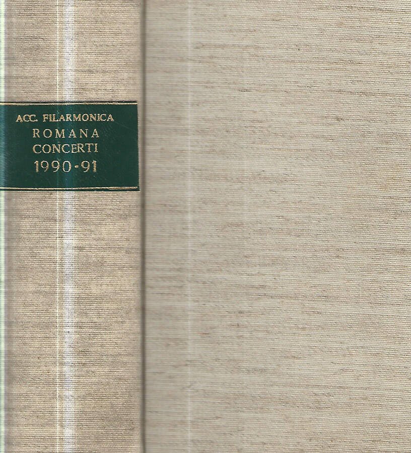 Raccolta completa dei libretti di presentazione degli spettacoli tenuti al Teatro Olimpico, dal numero 1-2-3 al numero 30 rispettivamente dal settembre 1990 all'aprile 1991, il numero A del 2 maggio 1991 ed un numero unico da maggio a novembre dello stesso anno, organizzati dall'Accademia Filarmonica Romana. Legatura tutta tela grezza, con titoli in oro solo al dorso all'interno di tassello verde ed in ottimo stato. Interno integro, con cerniera salda e ricco di pubblicità e con fogli ripiegati contenente i testi di alcuni concerti in italiano ed in tedesco. Pagine non numerate.