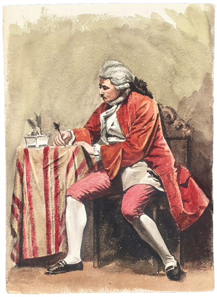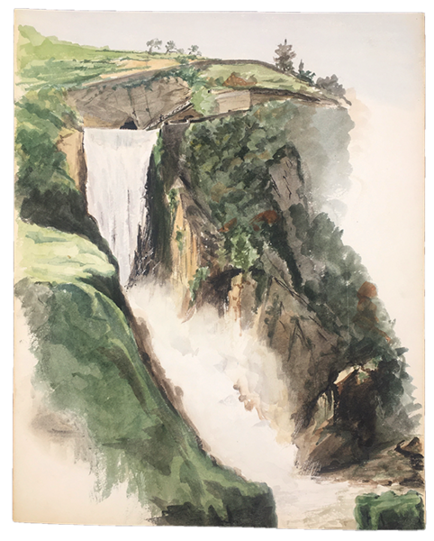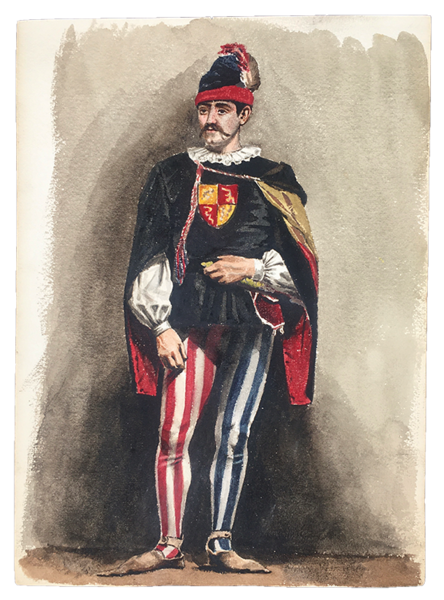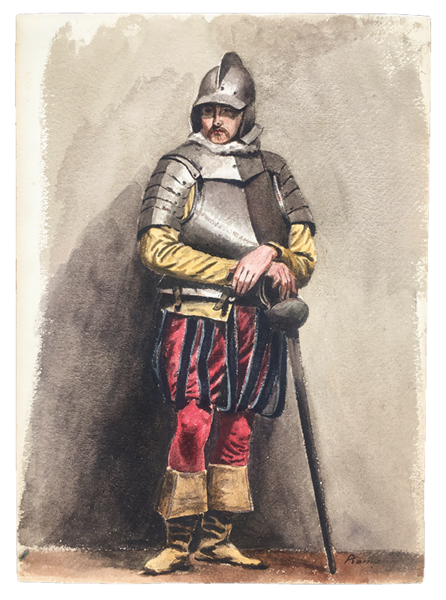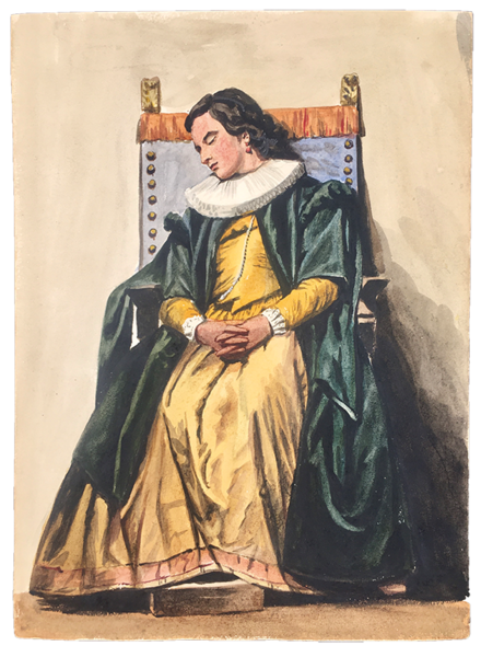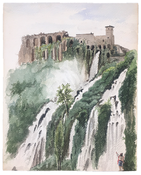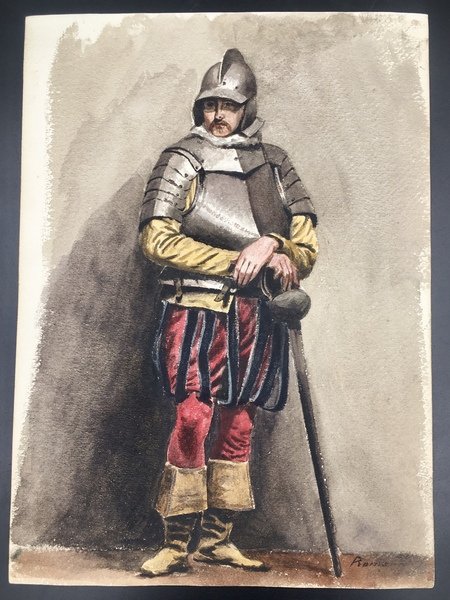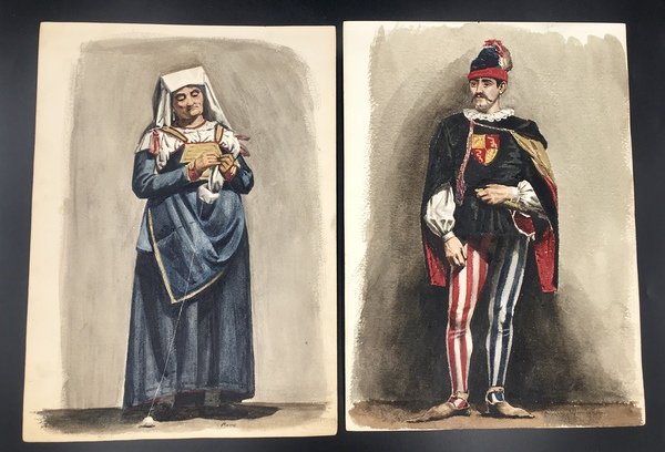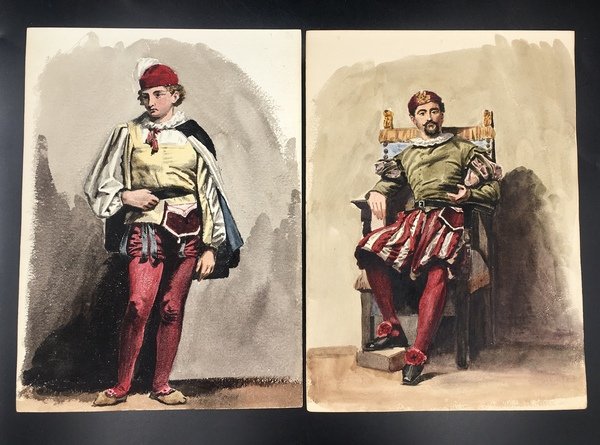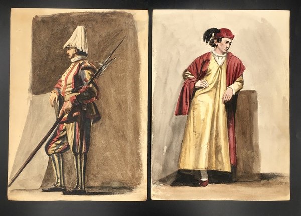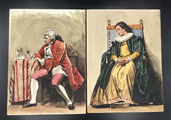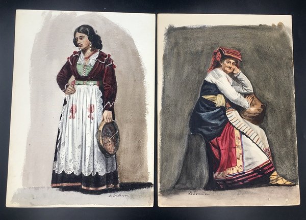 16 fogli in forte cartoncino da disegno, cm. 33x24. A) TEATRANTI: 1) Giovane e bruna NOBILDONNA in costume secentesco, appisolatasi seduta in poltrona tra una prova e l'altra; al verso, nitidamente e fascinosamente impresso per "effetto sindone" il nobiluomo allo scrittoio che compare acquerellato al n. 3). 2) NOBILUOMO con parrucca e abito settecentesco in atto di scrivere. 3) NOBILUOMO in costume barocco seduto in poltrona, argomentante. Al verso la stupefacente impronta del nobiluomo in piedi ritratto al n. 4). 4) NOBILUOMO barocco in piedi con pugnale; al verso la suggestiva impronta di un bel giovanotto mascherato (il cui acquerello non abbiamo). 5) PAGGIO in piedi. Al verso, appena un'ombra, l'mpronta della dama del n. 6). 6) DAMA in piedi, in sontuoso costume porpora. Al verso, ben visibile, l'impronta della dama del n. 7. 7) Pensosa DAMA BORGHESE in piedi. 8) GIOVANE BORGHESE in piedi; al verso, l'ombra del paggio del n. 5. B) COSTUMI LOCALI: 9) GUARDIA SVIZZERA. Al verso vaga ombra di donna in costume laziale. 10) Giovane POPOLANA in costume di TRASTEVERE. 11) Anziana POPOLANA di Roma, cuce, con gomitolo. Al verso, ombra di donna in costume di Nettuno (il cui acquerello non abbiamo). 13) Anziana DONNA in costume di SONNINO. 14) SOLDATO in corazza con spada. Al verso, ben visibile ma molto sfumata, l'ombra di altro soldato. C) 16) VEDUTA del Tempio di Vesta in TIVOLI con scorcio della Valle dell'Inferno, villa Gregoriana. 17) Cascata principale della Villa Gregoriana di TIVOLI (cm. 31x24). 18) Altre cascate della Villa Gregoriana di TIVOLI (cm. 31x24). SCHWEINITZ, scultore, dal 1855 al 1865 si formò alla Berliner Akademie sotto la guida di Hermann Schievelbein. Nel 1865 viaggiò in Italia, dedicandosi con successo di critica a elaborate figure di genere; pertanto a questo periodo risalgono certamente i nostri superbi acquerelli. Morì suicida nel 1896. (cfr. wikipedia). Scansioni su richiesta. Ogni acquerello di teatranti 80 Euro caduno. Gli altri, 100 Euro caduno. Tutti i 16 acquerelli