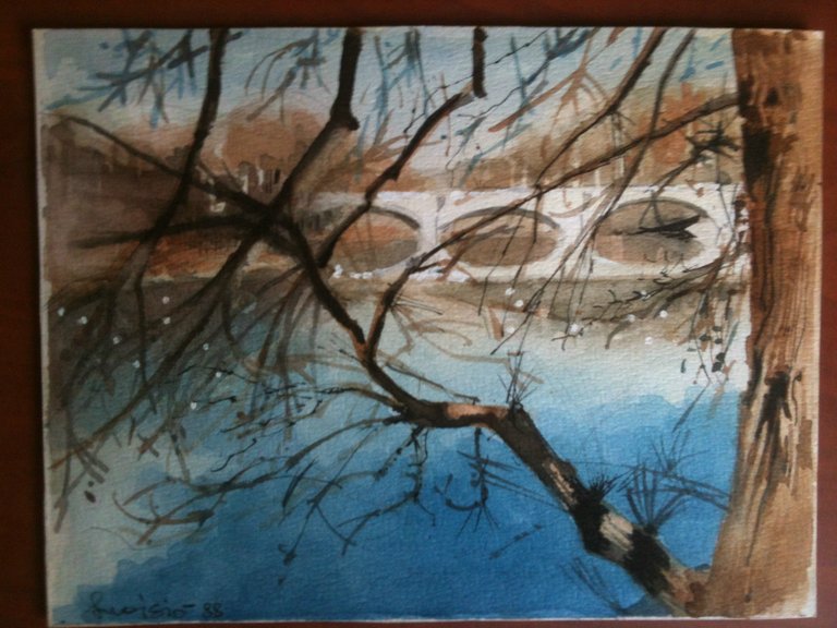 Acquerello originale 1988 "Torino, veduta del Po con ponte" Luoisiò? - E8842