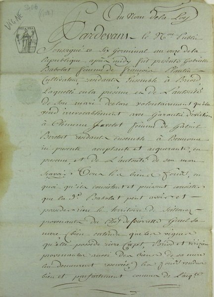 Acte de vente à Serrière de Briord (Virizieu, Seillonaz) (Ain) entre Gabrielle Babolat/François Plantin et Clémence Javelot d'un territoire avec vigne - 1803