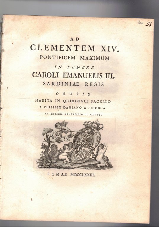 Ad Clemente XIV. Pontificem Maximum in funere Caroli Emanuelis III. Sardiniae regis. Oratio habita in quirinali sacello a Philippo Damiano a Priocca ad intimo pontificio cubicolo.