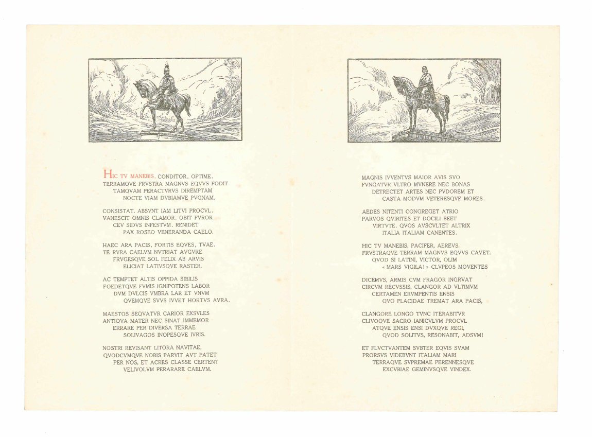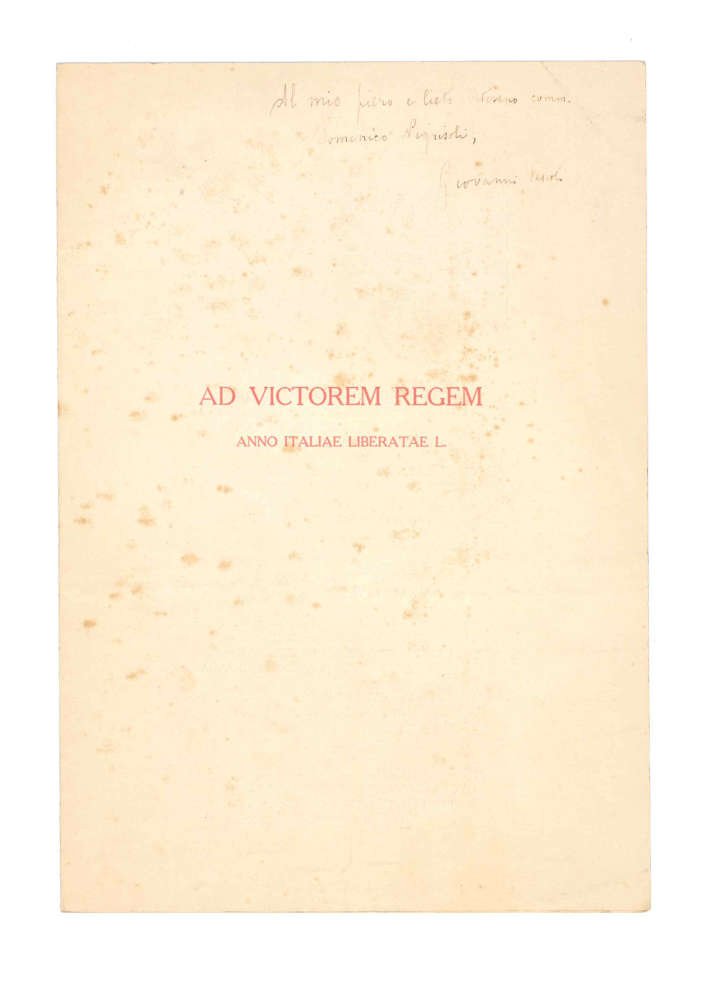 EPHEMERAPrima edizione autonoma del componimento.CON AUTOGRAFO.Minimi segni del tempo alle pagine esterne, nel complesso ben conservato. Effemeride di grande pregio estetico, impreziosita dalla dedica autografa dell’autore a Domenico Nigrisoli (lo zio di Bartolo Nigrisoli, medico e amico di Pascoli, firmatario nel 1925 del Manifesto degli intellettuali antifascisti): «Al mio fiero e lieto veterano comm. Domenico Nigrisoli. Giovanni Pascoli».Effemeride di grande pregio estetico. La poesia comparve originariamente sulle colonne del «Resto del Carlino» il 5 giugno 1911 (ma con titolo ‘Victori Regi’, testo ridotto e in parte diverso), a celebrare il cinquantenario dell’Unità. Testo ornato da due incisioni di A. Baruffi, Garibaldi e Vittorio Emanuele II a cavallo. Molto raro, Iccu registra solo le copie di Casa Pascoli, Archiginnasio di Bologna e Accademia virgiliana di Mantova.Pascoli, Carmina, ed. Valgimigli, pp. 524-525.