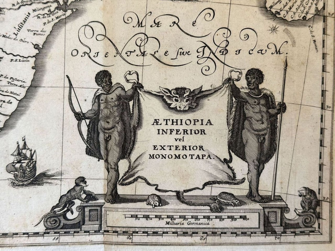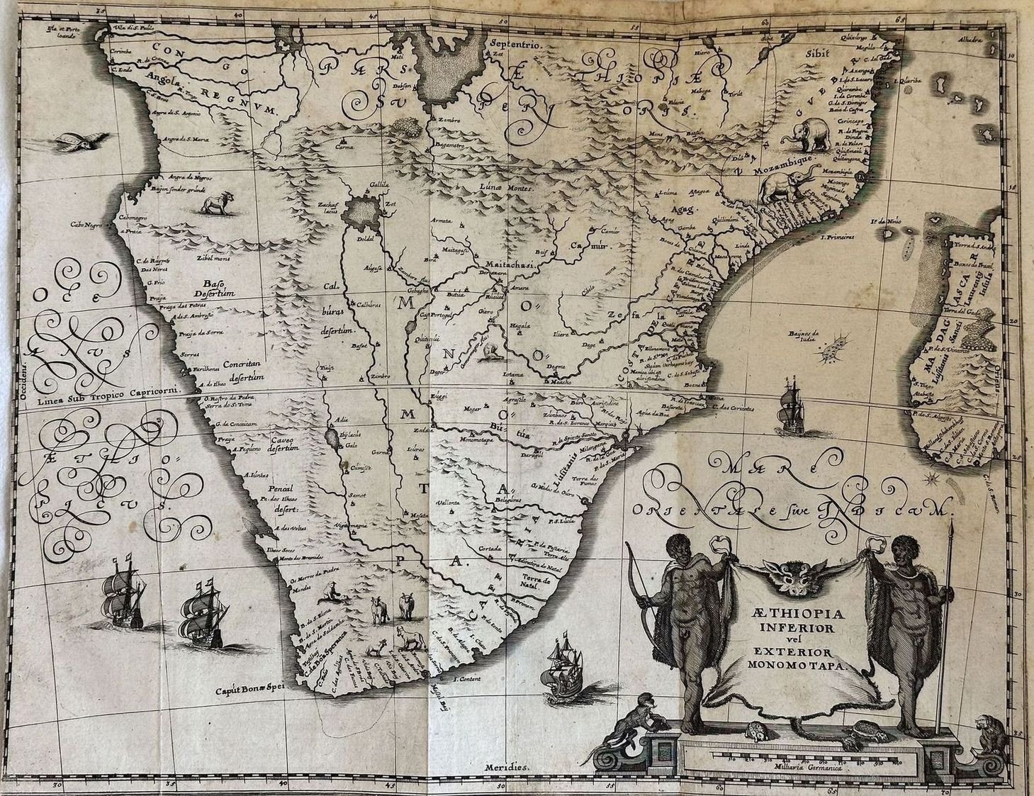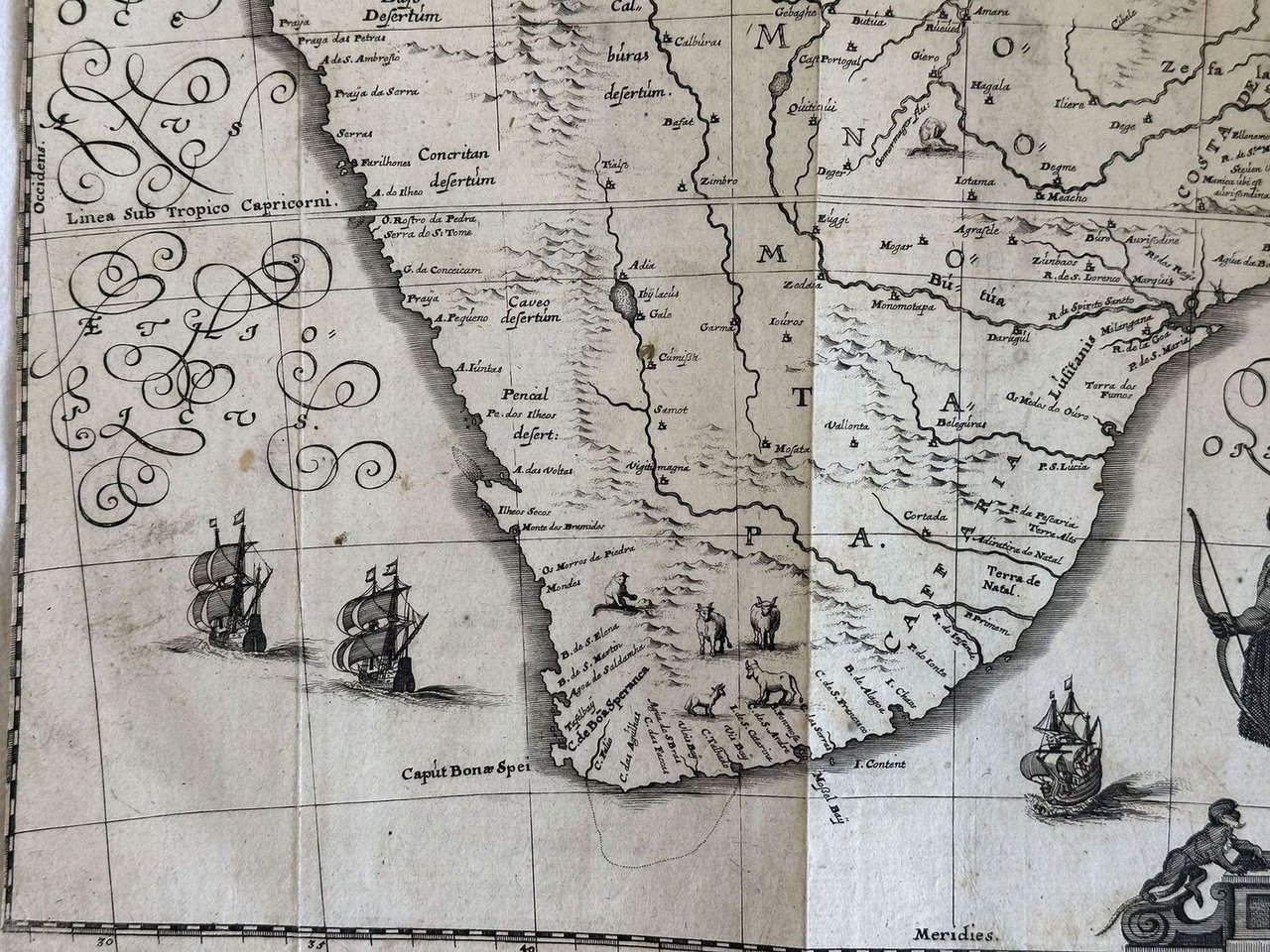 AUTORE: Matthaus Merian (1593-1650)<BR><BR>DATA: 1649 circa<BR><BR>TECNICA: incisione su rame<BR><BR>DIMENSIONI FOGLIO: 318 x 375 mm.<BR>DIMENSIONI INCISIONE: 288 x 370 mm. <BR>CONDIZIONI: eccellenti condizioni. Lievi fioriture<BR><BR> <BR><BR>Meravigliosa mappa in bianco e nero in larga scala del Sud Africa di Matthaeus Merian sulla base di quella di Jan Jansson. La mappa mostra la vista generale del Sud Africa con rappresentazione delle montagne e animali. Numerose imbarcazioni in mezzo al mare. Jan Jansson faceva parte di un influente famiglia di cartografi del XVII secolo originari dei Paesi Bassi.Title: “Aethiopia inferior vel exterior” from Archontologia cosmica 1649 circa Sheet size: 12.52 x 14.76 in; 318 x 375 mm. Plate area: 11.34 x 11.81 in; 288 x 370 mm. Author: Matthaus Merian (1593-1650) Technique: Copper engraving Overall condition: Good condition, with light foxing. A wonderful large scale black and white map of South Africa by Matthaus Merian but derived from Jan Jansson. The map shows a general view of South Africa with representation of mountains and animals. Different ships in the middle of the sea. Jan Jansson was part of an influential family of map publishers from the Netherland throughout the 17th century and beyond. They were based in Arnhem than in Amsterdam. They were printers, publishers and booksellers. Overall Condition: Excellent