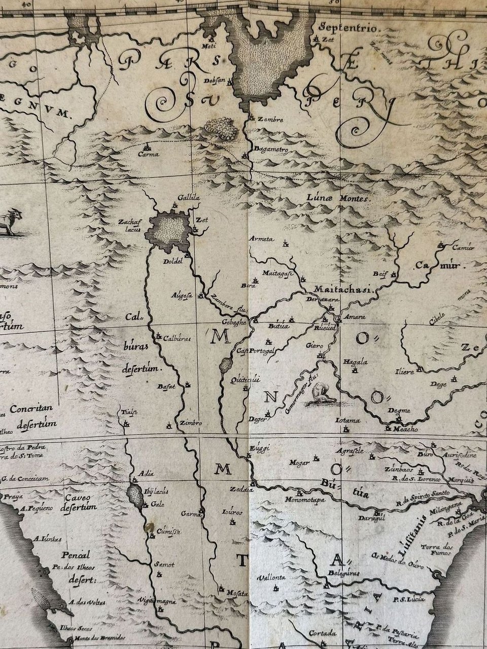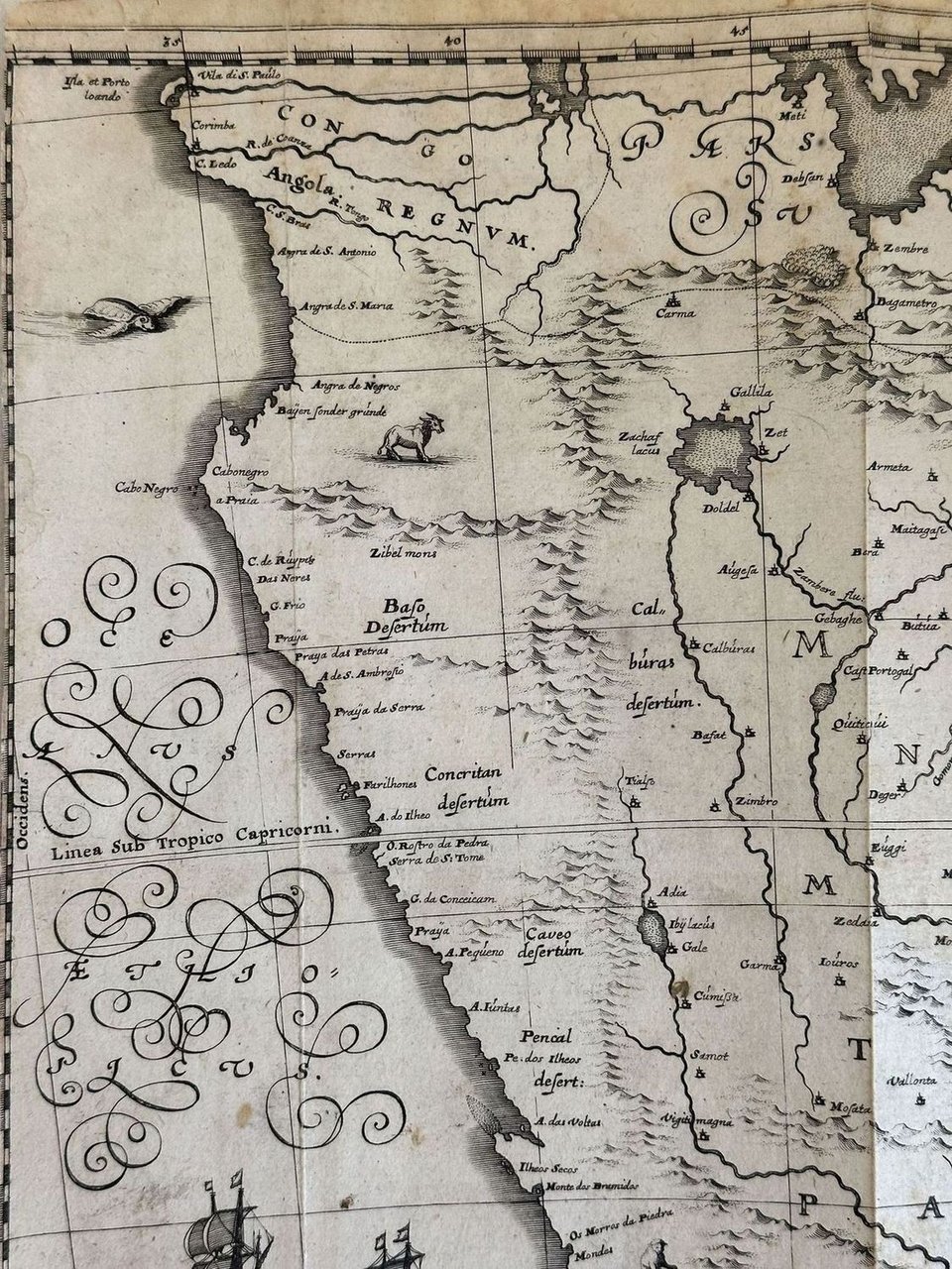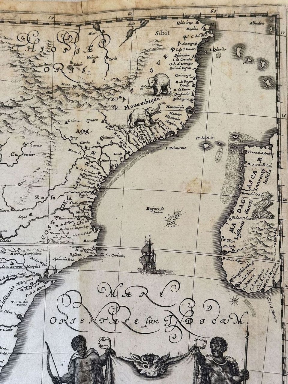 AUTORE: Matthaus Merian (1593-1650)<BR><BR>DATA: 1649 circa<BR><BR>TECNICA: incisione su rame<BR><BR>DIMENSIONI FOGLIO: 318 x 375 mm.<BR>DIMENSIONI INCISIONE: 288 x 370 mm. <BR>CONDIZIONI: eccellenti condizioni. Lievi fioriture<BR><BR> <BR><BR>Meravigliosa mappa in bianco e nero in larga scala del Sud Africa di Matthaeus Merian sulla base di quella di Jan Jansson. La mappa mostra la vista generale del Sud Africa con rappresentazione delle montagne e animali. Numerose imbarcazioni in mezzo al mare. Jan Jansson faceva parte di un influente famiglia di cartografi del XVII secolo originari dei Paesi Bassi.Title: “Aethiopia inferior vel exterior” from Archontologia cosmica 1649 circa Sheet size: 12.52 x 14.76 in; 318 x 375 mm. Plate area: 11.34 x 11.81 in; 288 x 370 mm. Author: Matthaus Merian (1593-1650) Technique: Copper engraving Overall condition: Good condition, with light foxing. A wonderful large scale black and white map of South Africa by Matthaus Merian but derived from Jan Jansson. The map shows a general view of South Africa with representation of mountains and animals. Different ships in the middle of the sea. Jan Jansson was part of an influential family of map publishers from the Netherland throughout the 17th century and beyond. They were based in Arnhem than in Amsterdam. They were printers, publishers and booksellers. Overall Condition: Excellent