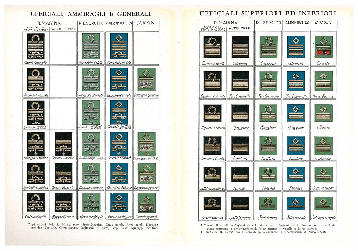 In 8vo (mm 229x169); pp. 119, [3], [2] c. di tav. ripiegate fuori testo, [1] tabella contenente le raffigurazioni a colori dei vari gradi di tutte le forze armate. Numerose illustrazioni in bianco e nero nel testo. Mezza tela editoriale. Copertina anteriore illustrata da Maffei. Piccole mancanze marginali alle copertine.