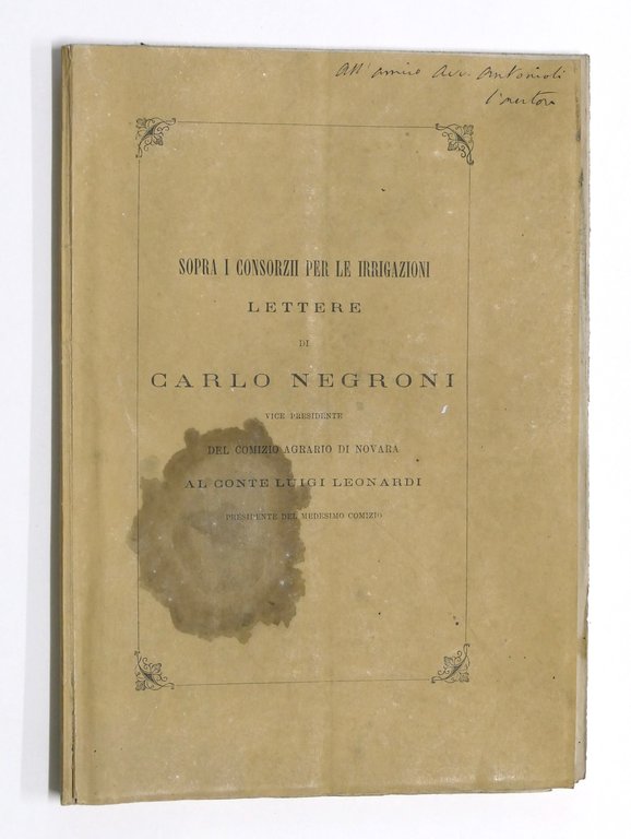 Storia Agraria Sopra i Consorzii per le irrigazioni - Lettere di Carlo Negroni vice presidente del Comizio Agrario di Novara al Conte Luigi Leonardi presidente del medesimo Comizio - 1872 - pag. 51 Copertina morbida. Testo in italiano. Buone condizioni. Copertina come da foto.