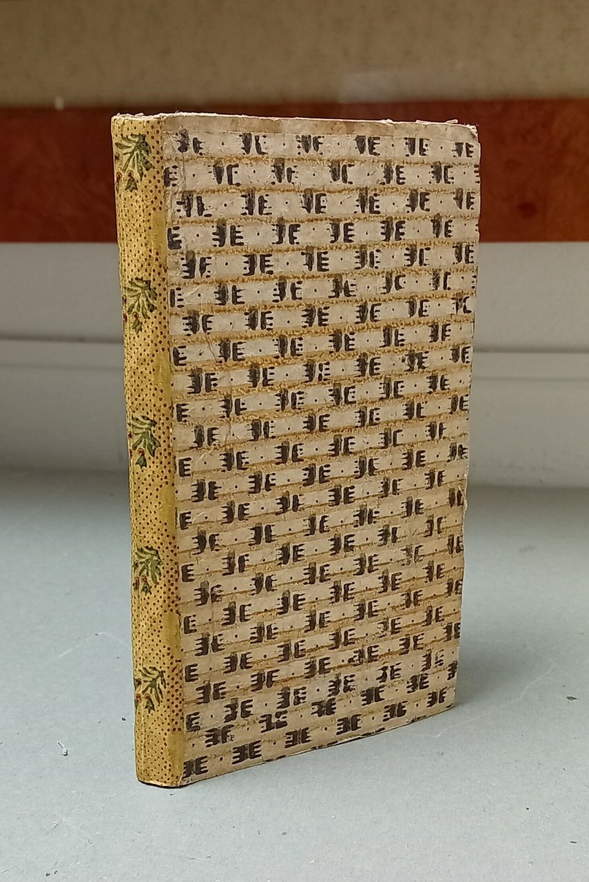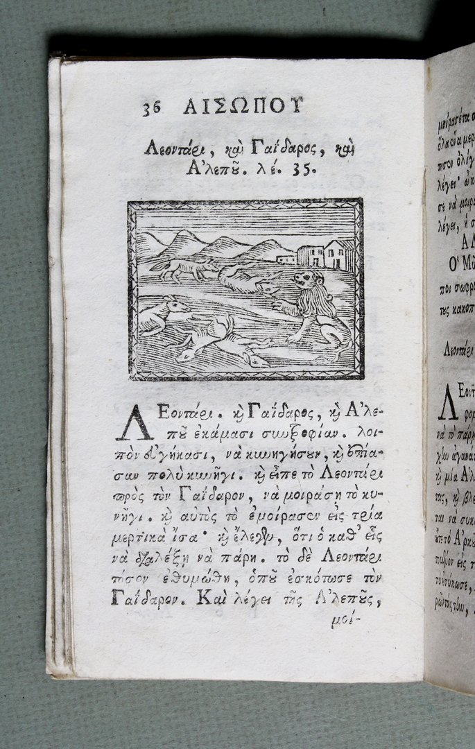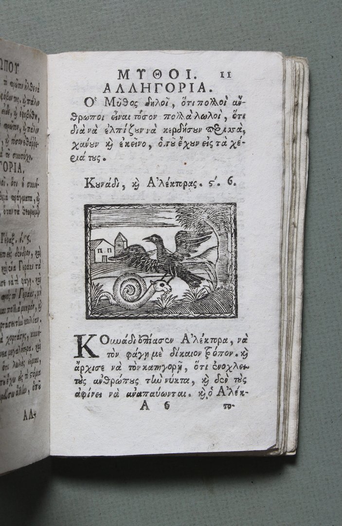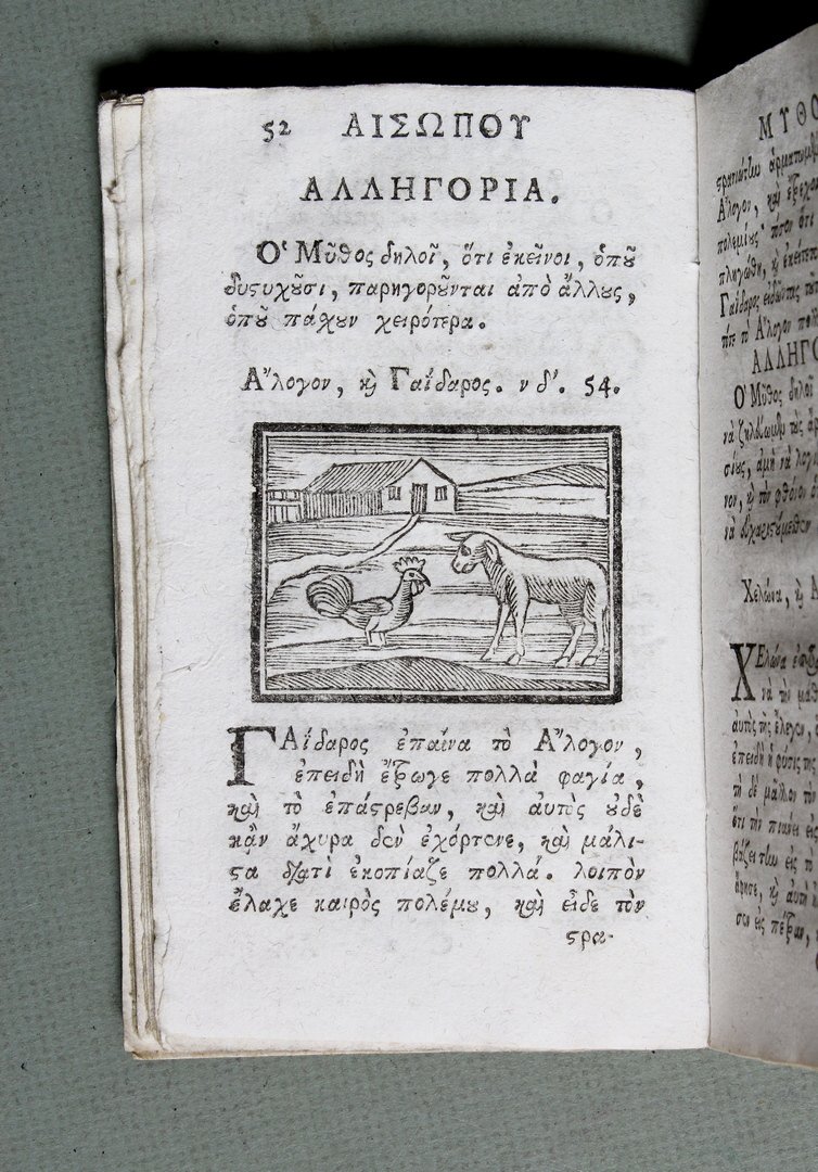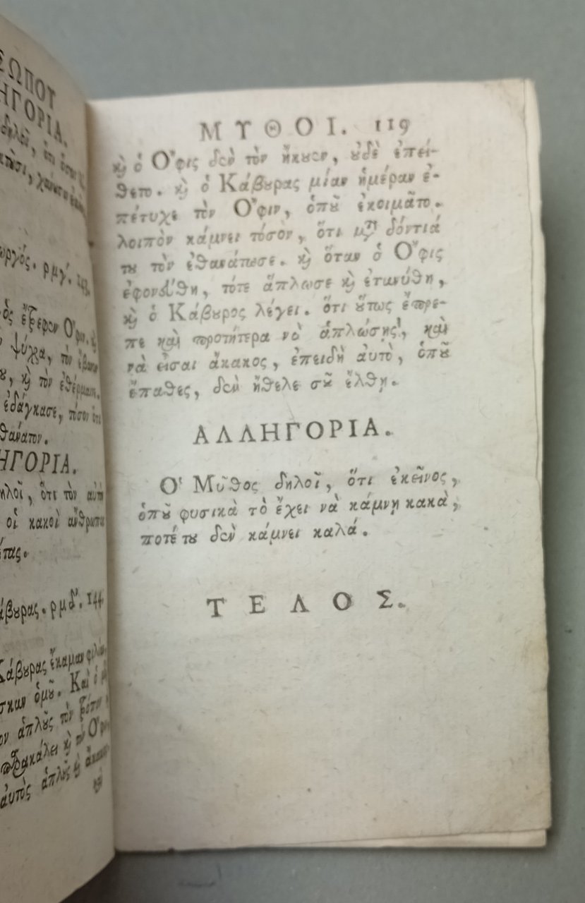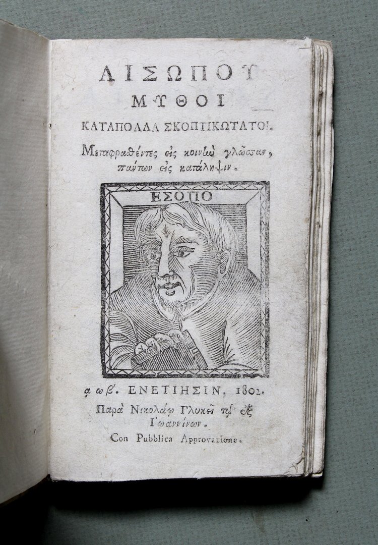In-8°; 120 pp., 13 xilografie nel testo e ritratto di Esopo al titolo. Legatura coeva in tutto cartoncino ricoperto da carta decorata, rinforzo al dorso (sguardie rinnovate). Rarissima edizione popolare delle favole di Esopo, stampata in greco dalla celebre tipografia veneziana Glikis.