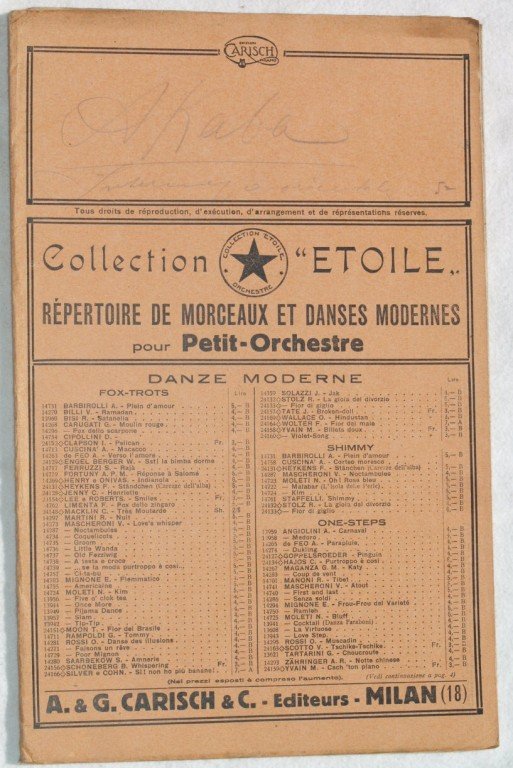 In 8. cm 27,5x18. Pp. 25. partitura completa per orchestra del 1922 di una canzone. Caratteristica copertina illustrata d'epoca. Titolo manoscritto in copertina. In buone condizioni. a complete score for orchestra of 1922. Carachteristic decorated cover of that period. Ex libris in the cover. In good conditions.