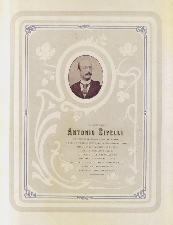 AL Commendatore Antonio Civelli per quattro legislature deputato di Firenze che alle opere delle beneficenza ed alle lotte del lavoro diede e da fatica e tempo ed ingegno con alto intelletto d'amore nel giorno in cui la fiducia del Re lo chiama a far parte del Senato gli addetti allo stabilimento Civelli di Milano, memori, lieti, beneauguranti, mandano il loro riverente saluto.