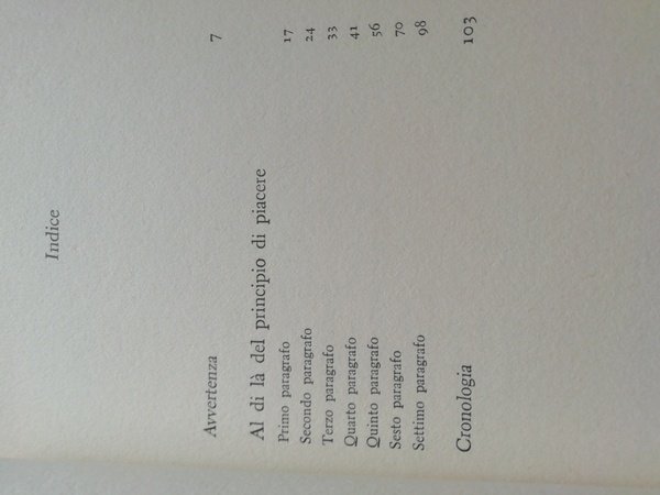 PRIMA EDIZIONE nella Biblioteca Boringhieri, unica traduzione italiana integrale. Al di là del principio di piacere è un saggio di Sigmund Freud pubblicato nel 1920, incentrato sui temi dell'Eros e del Thanatos, ovvero rispettivamente la "pulsione di vita" (Lebenstrieb) e la "pulsione di morte" (Todestrieb[e]). Freud formula il conflitto psicologico in termini dualistici fin dai suoi primi scritti, ma è solo in questo testo che egli presenta un simile conflitto mediante concetti desunti dal pensiero di Empedocle, il quale parla d'un dissidio cosmico fra i princìpi o forze di Amore (o Concordia) e Odio (o Discordia). n brossura. Pp. 109. Ottime condizioni.