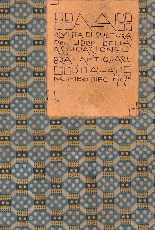In-8° (cm.24), brossura editoriale figurata (di Edoardo Fontana), carta patinata con illustrazioni in nero n.t. Annuario dell'Associazione Librai Antiquari d'Italia che contiene testi di bibliofilia e bibliografia di: Lucio Gambetti (Questo matrimonio non s’ha da fare. Storia della collana «C’era non c’era»); Alberto Brambilla (Appunti bibliografici su Piero Chiara: strategie editoriali, ricerca e collezionismo); Antonio Castronuovo (Sanminiatelli e i suoi diari, esistenti e no); Bruno Sabelli (Germania docet); Mauro Chiabrando (Longanesi, che spettacolo!); Patrizia Caccia (Carlotta Rimini, editrice, scrittrice e poetessa); Chiara Araldi (Libreria Zanichelli: alcuni ‘assaggi’ sulla parentesi antiquaria dell’editrice bolognese); Edoardo Fontana (Addenda al catalogo dell’opera grafica di Emilio Mantelli. Ritrovamenti 2022-2024); Enrico Tallone (Ulysses, un romanzo nel romanzo); Domenico Calò (Appunti sparsi di storia della legatura d’arte moderna a Bologna); Renzo Marini (Indagini sui sonetti umoristici di Giuseppe Gioacchino Belli, 1864); Giovanni Biancardi (Un raro opuscolo di Monaldo Leopardi. Le Stanze del 1801). Numero speciale con il copioso indice delle annate a cura di Elena Guerra.