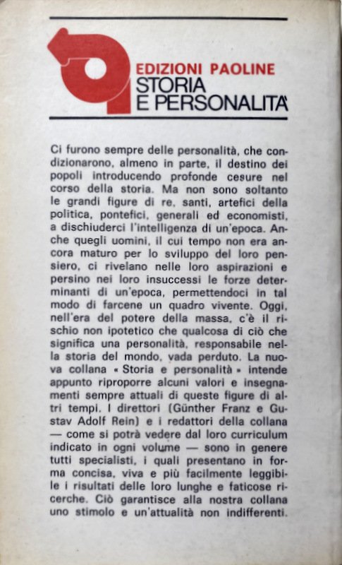 Ci furono sempre delle personalità, che condizionarono, almeno in parte, il destino dei popoli introducendo profonde cesure nel corso della storia. Ma non sono soltanto le grandi figure di re, santi, artefici della politica, pontefici, generali ed economisti, a dischiuderci l'intelligenza di un'epoca. Anche quegli uomini, il cui tempo non era ancora maturo per lo sviluppo del loro pensiero, ci rivelano nelle loro aspirazioni e persino nei loro insuccessi le forze determinanti di un'epoca, permettendoci in tal modo di farcene un quadro vivente. Oggi, nell'era del potere della massa, c'è il rischio non ipotetico che qualcosa di ciò che significa una personalità, responsabile nella storia del mondo, vada perduto. La nuova collana Storia e personalità intende appunto riproporre alcuni valori e insegnamenti sempre attuali di queste figure di altri tempi. I direttori (Günther Franz e Gustav Adolf Rein) e i redattori della collana, come si potrà vedere dal loro curriculum indicato in ogni volume sono in genere tutti specialisti, i quali presentano in forma concisa, viva e più facilmente leggibile i risultati delle loro lunghe e faticose ricerche. Ciò garantisce alla nostra collana uno stimolo e un'attualità non indifferenti.