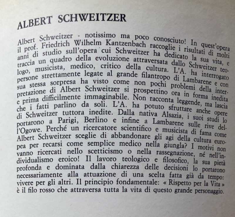 Albert Schweitzer notissimo ma poco conosciuto! In quest'opera il prof. Friedrich Wilhelm Kantzenbach raccoglie i risultati di molti anni di studio sull'opera cui Schweitzer ha dedicato sua vita, e traccia un quadro della evoluzione attraversata dallo Schweitzer teologo, musicista, medico, critico della cultura. L'A. ha interrogato persone strettamente legate al grande filantropo di Lambarene e con sua stessa sorpresa ha visto come non pochi problemi della interpretazione di Albert Schweitzer si prospettino ora in forma inedita e prima difficilmente immaginabile. Non racconta leggende, ma lascia che i fatti parlino da soli. L'A. ha potuto sfruttare anche opere di Schweitzer tuttora inedite. Dalla nativa Alsazia, i suoi studi lo portarono a Parigi, Berlino e infine a Lambarene sulle rive del l'Ogowe. Perché un ricercatore scientifico e musicista di fama come Albert Schweitzer sceglie di abbandonare gli agi della cultura europea per recarsi come semplice medico nella giungla? I motivi non vanno ricercati nello scetticismo o nella rassegnazione, né nell'individualismo eroico! Il lavoro teologico e filosofico, la sua pietà profonda e dominata dalla chiarezza delle decisioni lo portarono necessariamente alla attuazione di una scelta fatta già da tempo: vivere per gli altri. Il principio fondamentale: Rispetto per la Vita è il filo rosso che attraversa tutta la vita di questo grande personaggio.