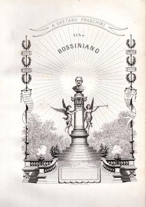 Voto musicale di Gioachino Rossini commentato ed illustrato da un epistolariodi celebri contemporanei dedicato a Gaetano Fraschini. Mancano le due pagine di firme in facsimile