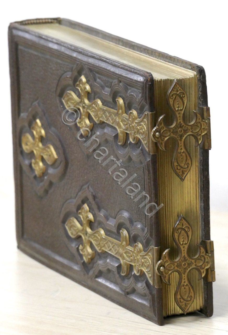 Album d'epoca per raccolta di fotografie formato 6 x 10 cm - fine '800 - VUOTO 20 pagine in cartoncino rigido. Copertina rigida - Borchie di chiusura come da foto. Dimensioni: 15 x 23 x 4 cm ca. Buone condizioni generali. Piccoli segni del tempo.