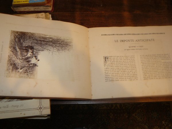 In 4° oblungo, pagg. 54 con 6 tavole fotografiche, testo incorniciato, xilografie n.t., legatura in tela editoriale con impressioni a secco, titoli oro al piatto. Ottima copia. In fondo elenco dei capi d'arte acquistati alla pubblica esposizione.