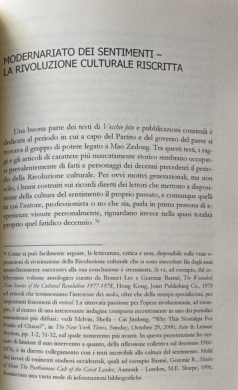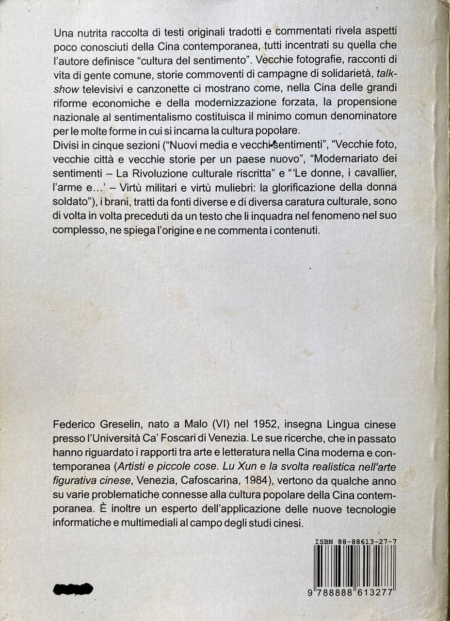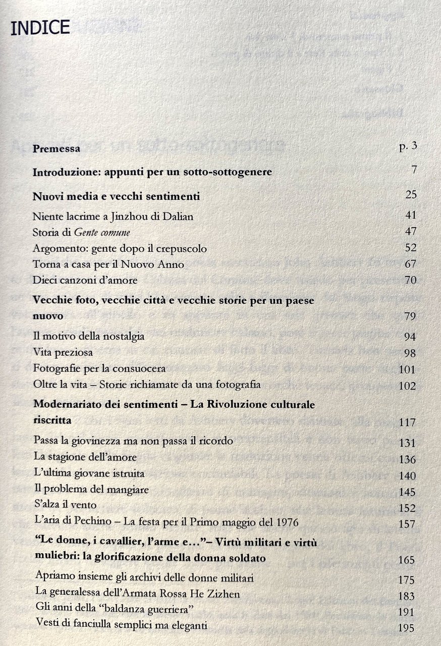 Una nutrita raccolta di testi originali tradotti e commentati rivela aspetti poco conosciuti della Cina contemporanea, tutti incentrati su quella che l'autore definisce cultura del sentimento. Vecchie fotografie, racconti di vita di gente comune, storie commoventi di campagne di solidarietà, talk-show televisivi e canzonette ci mostrano come, nella Cina delle grandi riforme economiche e della modernizzazione forzata, la propensione nazionale al sentimentalismo costituisca il minimo comun denominatore per le molte forme in cui si incarna la cultura popolare. Divisi in cinque sezioni (Nuovi media e vecchi sentimenti, Vecchie foto, vecchie città e vecchie storie per un paese nuovo, Modernariato dei sentimenti, La Rivoluzione culturale riscritta e Le donne, i cavallier, l'arme e. - Virtù militari e virtù muliebri: la glorificazione della donna soldato), i brani, tratti da fonti diverse e di diversa caratura culturale, sono di volta in volta preceduti da un testo che li inquadra nel fenomeno nel suo complesso, ne spiega l'origine e ne commenta i contenuti.