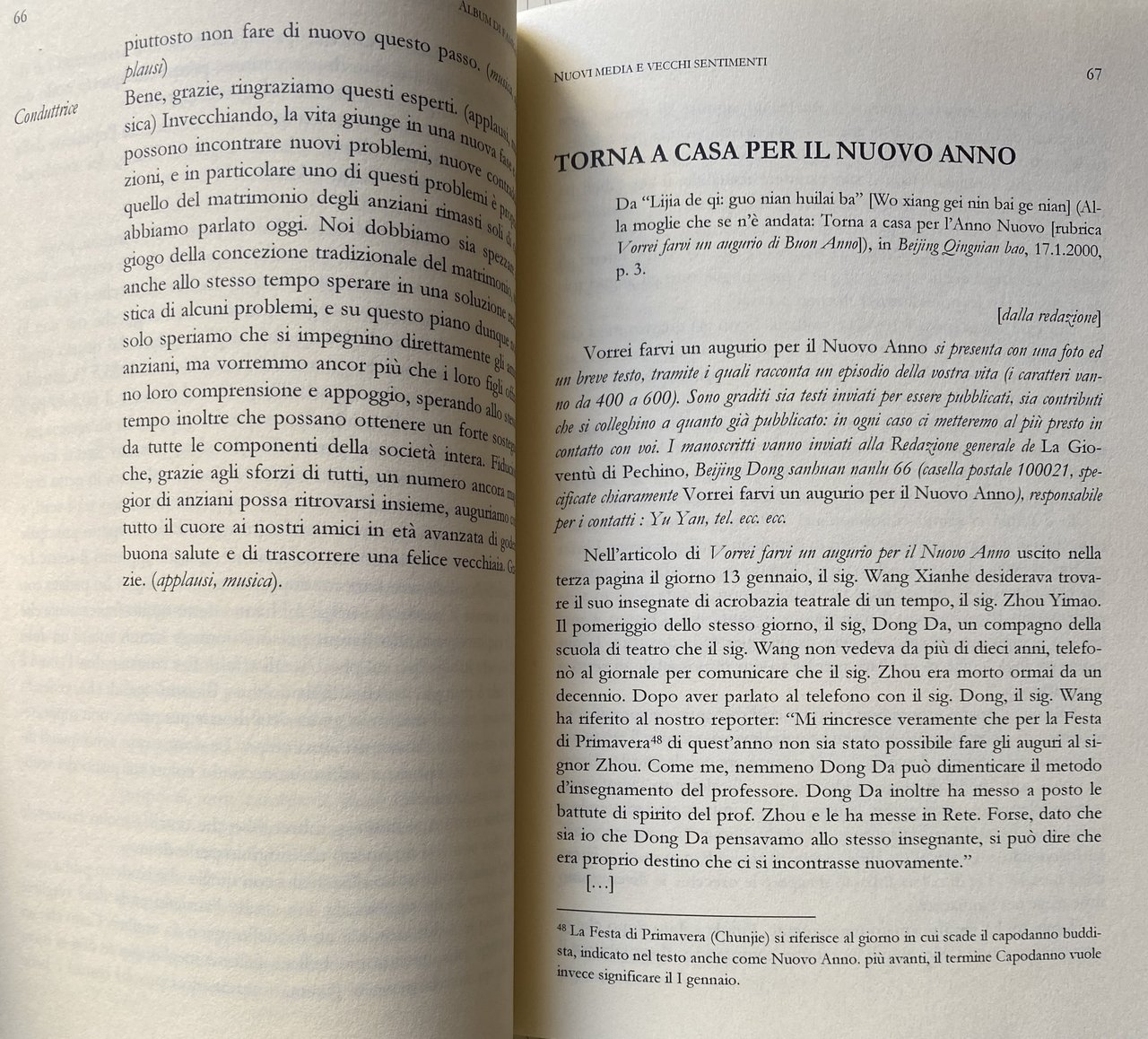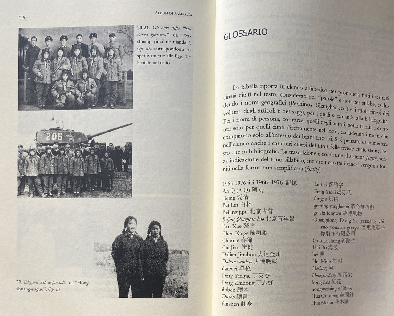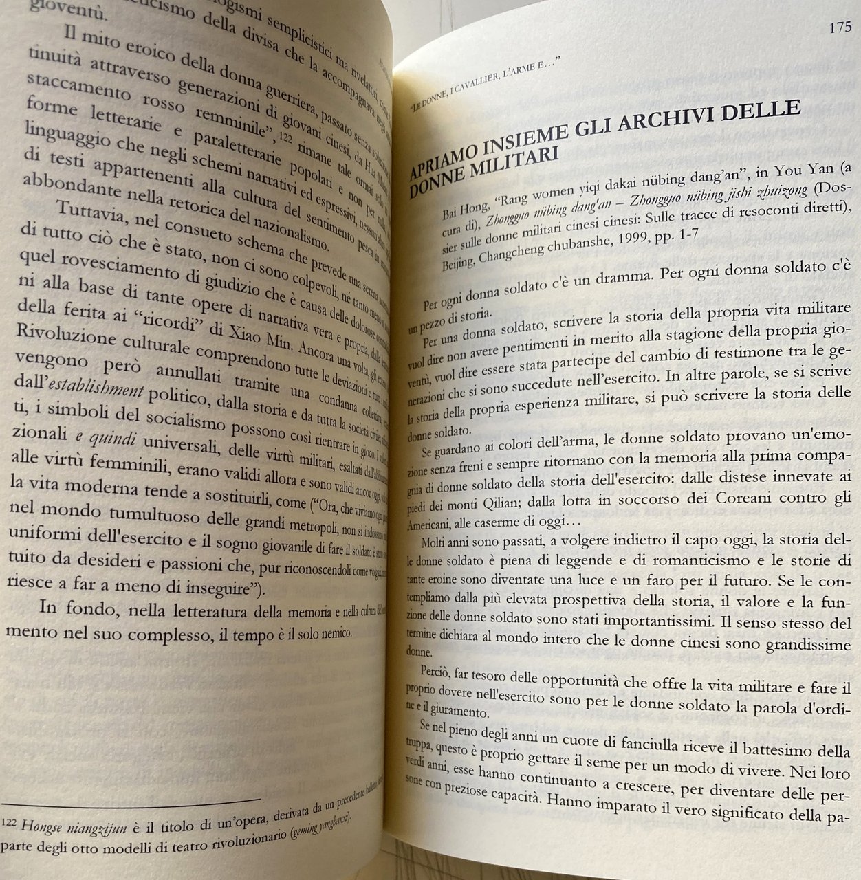 Soggetti: Studi culturali, Asia, Cina, Cinesi, Viaggio, Società, Sociologia, Antropologia, Cultura cinese, Lingua, Caratteri, Ideogrammi, Opere generali, Album fotografici, Fotografie d'epoca, Racconti, Reportage, Biografie, Memorie, Vita quotidiana, Contadini, Provincia, Villaggi, Campagna, Città vecchie, Storie vere, Donne, Militari, Soldatesse, Brani, Poemi, Poesie, Letteratura, Testi originali, Modi di dire, Collezionismo, Libri rari Vintage fuori catalogo da collezione, Comunicazione, Stato, Governo, Politica, Comunismo, Partito comunista, Controllo sociale, Inediti, Libri universitari Studi antropologici Pechino Glossario Bibliografia Riferimento Nuovi media Niente lacrime a Jinzhou Dalian Gente comune Nuovo Anno Capodanno cinese Canzoni d'amore Nostalgia Modernariato Sentimenti Rivoluzione culturale Giovinezza Stagioni Giovani istruiti Istruzione Scuola Bambini Figli Totalitarismo Mangiare Cibo Alimentazione Cucina locale Feste Primo maggio Anni Settanta Virtù militari muliebri Glorificazione Donna soldato Archivi Armata Rossa He Zizhen Baldanza guerriera Impero celeste Burocrazia Abiti Abbigliamento tradizionale Traduzioni Shanghai Trascrizione Sistema Pinyin Fantizi Mandarino Seta Polizia Trasmissioni televisive Piazza Tienanmen Mao Tse Tung Manifesti Ideologia Nuova generazione Cinema Zhang Yimou Titanic America Censura Internet Rete Diritti umani Diritto Espressione Libertà Parola Manifestazioni Diacritici Toni Versi John Asbery Wang Meng Mediatori Editoria Stampa Ah Q Wang Shuo Lu Hsun Mito americano Attori Tecnologia Scatole La strada verso casa Critica Moda Generi letterari Sottogeneri Sentimentalismo Élite Soft power Influenze culturali Giappone Corea Regime Pubblico Modernizzazione Chen Kaige Xing Produzione letteraria Fumetti Paolo Santangelo Zedong Flavia Solieri Angelika Taschen Valeria Varriano Prostitute Fengsu Xiangchou Case Confucio Hei Ming Yanan Cultural studies China Chinese Travel Society Sociology Anthropology Chinese culture Language Characters Ideograms General works Photo albums Vintage photographs Stories Biographies Memories Daily life Peasants Province Villages Countryside Old cities True stories Women Military Soldiers Songs Poems Literature Original texts Idioms Collectibles Rare books out of print Collector's catalog Communication State Government Politics Communism Communist Party Social Control Unpublished University Books Anthropological Studies Beijing Glossary Bibliography Reference No Tears Ordinary People New Year Chinese Love Songs Modern Art Feelings Cultural Revolution Youth Seasons Educated Youth Education School Children Totalitarianism Eating Food Local cuisine Parties May Day 1970s Female military virtues Glorification Female soldier Archives Red Army Warrior Boldness Celestial Empire Bureaucracy Clothes Traditional clothing Translations Transcription Fantizi System Mandarin Silk Police Television broadcasts Tiananmen Square Posters Ideology New generation Censorship Network Human rights Law Expression Freedom of speech Demonstrations Diacritics Tones Verses Mediators Publishing Printing American myth Actors Technology Boxes The road home Criticism Fashion Literary genres Subgenres Sentimentalism Cultural influences Japan Korea Regime Public Modernization Literary production Comics Prostitutes Houses Confucius Sinology Sinologia