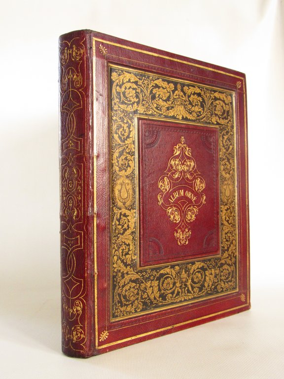 Branston | London 1840 (S.d) | 24 x 30.50 cm | relié | [ENGLISH DESCRIPTION ON DEMAND] | Recueil constitué par une main anonyme de chromolithographies, de gravures. Nombreuses pages avec des encadrements divers, gothiques, ornementaux, destinés à recevoir des gravures. Frontispice en chromolithographie rehaussé de couleurs. Les papiers destinés à recevoir dessins, gravures ou chromos sont de diverses couleurs, bleus, verts, crèmes, roses. Le recueil se termine par des feuillets de partition qui sont demeurés vierges. Reliure d'éditeur anglaise en plein chagrin bordeaux. Dos lisse orné d'une grande plaque ornementale romantique. Plats avec un rectangle central en relief décoré d'un grand fer avec l'inscription : Album orné, fers à froid d'encadrement. Riche frise Renaissance en papier d'encadrement. Frise à froid d'encadrement et filets d'encadrement avec petits fers angulaires. Papier de garde représentant une grande dentelle. Ce type de recueil, destiné aux familles, et qu'on remplissait de gravures ou de dessins, est un beau et rare témoignage de l'époque romantique. Habillé d'une riche reliure d'éditeur, il était fait pour orner les salons. Les pages possèdent un ou plusieurs encadrements et donc une ou plusieurs gravures que l'on découpait pour ensuite les coller. On y trouve des gravures, des lithographies, certaines en couleurs, 2 dessins, un lavis, le tout sur 60 feuillets. Rare témoignage de l'époque romantique, keepsake familial ou personnel, dans une riche reliure d'éditeur anglaise. NB : Cet ouvrage est disponible à la librairie sur demande sous 48 heures.