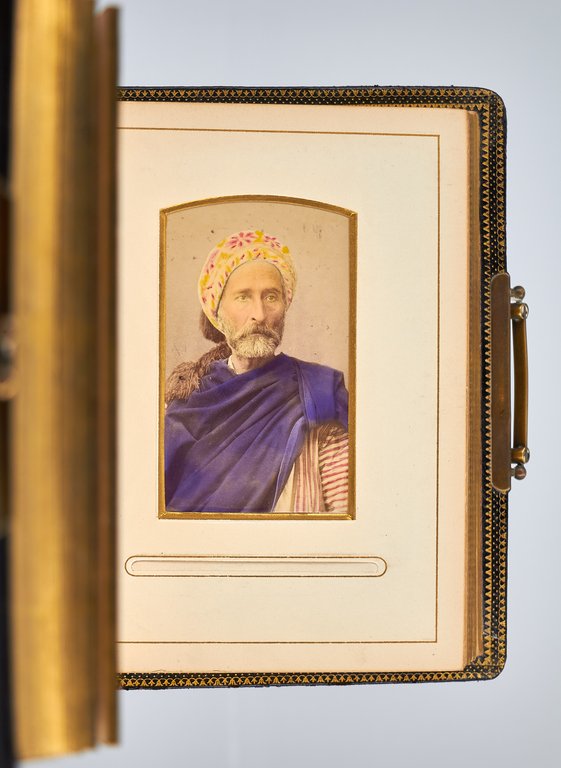 Alger [Algiers] s. d. [circa 1870] | 13 x 17 cm | 28 portraits sur cartes de visite consignés dans un album | Photographic album containing 28 portraits of Algerians finely enhanced with watercolour Algiers [ca 1870] | Album: 13 x 17 cm / photographs: 6.3 x 10.4 cm | 28 carte de visite portraits in an album Photographic album comprising 28 photograph portraits, in contemporary albumen print, pasted on card in carte-de-visite format.These photographs, well contrasted and finely enhanced with watercolour at the time, are of great intensity: the models stare at the photographer's lens with pride and nobility. Binding in full black grained leather, metal clasp, all edges gilt. Rubbing. Superb photographic testimony by one of the first European photographers established in Algeria. A Swiss expatriate in Algeria, Jean Geiser (1848-1923) was immersed in photography from childhood. In 1852, his mother joined forces with Antoine Alary, one of the pioneers of Algerian photography; together they founded a studio which lasted until 1867, when Jean Geiser took charge. Initially specialising in portraits of the city's European bourgeois, the photographer quickly understood the city's interest for folk images. These rare and magnificent “typical” portraits, depicting all the layers of the indigenous populations – from street children to caïd – are today sought after for their ethnographic value, testimony of an Algeria at the dawn of colonisation. * [FRENCH VERSION FOLLOWS] | Album photographique constitué de 28 portraits photographiques, en tirage albuminé d'époque, contrecollés sur des cartons au format carte de visite. Ces photographies, bien contrastées et finement rehaussées à l'aquarelle, sont d'une grande intensité : les modèles y fixent avec fierté et noblesse l'objectif du photographe. Reliure en plein cuir noir grainé, fermoir de métal, toutes tranches dorées. Frottements. Superbe témoignage par l'un des premiers photographes européens établis en Algérie. Suisse expatrié en Algérie, Jean Geiser (1848-1923) a baigné dans la photographie depuis son enfance. En 1852, sa mère s'associe à Antoine Alary, l'un des pionniers de la photographie algérienne ; ensemble ils fondent un studio qui perdurera jusqu'en 1867 date à laquelle Jean Geiser prendra sa direction. D'abord spécialisé dans les portraits de bourgeois européens de la ville, le photographe comprend bien vite l'intérêt de la métropole pour les images folkloriques. Ces rares et magnifiques portraits « types », dépeignant toutes les couches de la population indigène - de l'enfant des rues au caïd - sont aujourd'hui recherchés pour leur valeur ethnographique, témoignage d'une Algérie à l'aube de la colonisation.