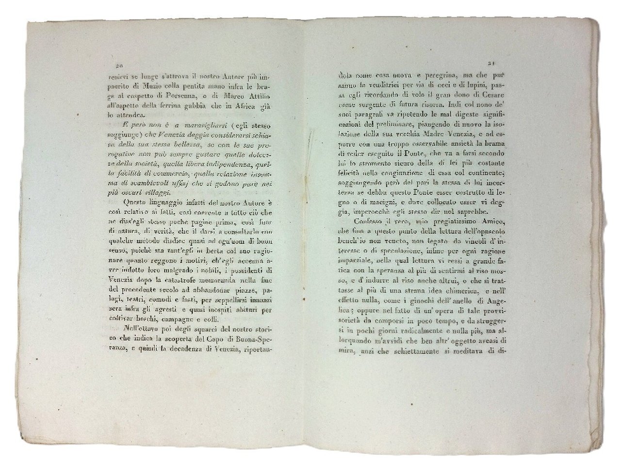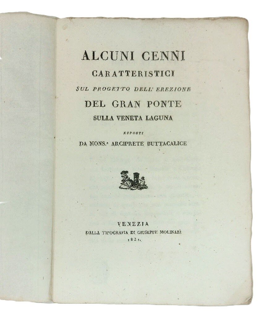 >In-8 (235x160 mm), pp. 68, perfetta brochure originale in carta azzurra con greca stampata ad entrambi i piatti. L'autore nel 1813 assunse il titolo di parroco e arciprete di Campalto (Venezia). Tra il 1807 e l'anno successivo vennero date alle stampe ben tre sue dissertazioni che riguardavano i mutamenti urbanistici e architettonici di piazza S. Marco, che videro l'abbattimento della cinquecentesca chiesa sansoviniana di S. Geminiano. Più di una ventina d'anni dopo, con questo lavoro, la sua voce si alzò con toni poco illuminati contro l'opportunità della realizzazione del ponte translagunare che, progettato dagli ingegneri Giovanni Milani, Tommaso Meduna e Luigi Duodo, venne realizzato tra il 1841 e il 1846, unendo con una strada ferrata Venezia alla terraferma. Ottimo stato, alcuni fogli ancora intonsi.
