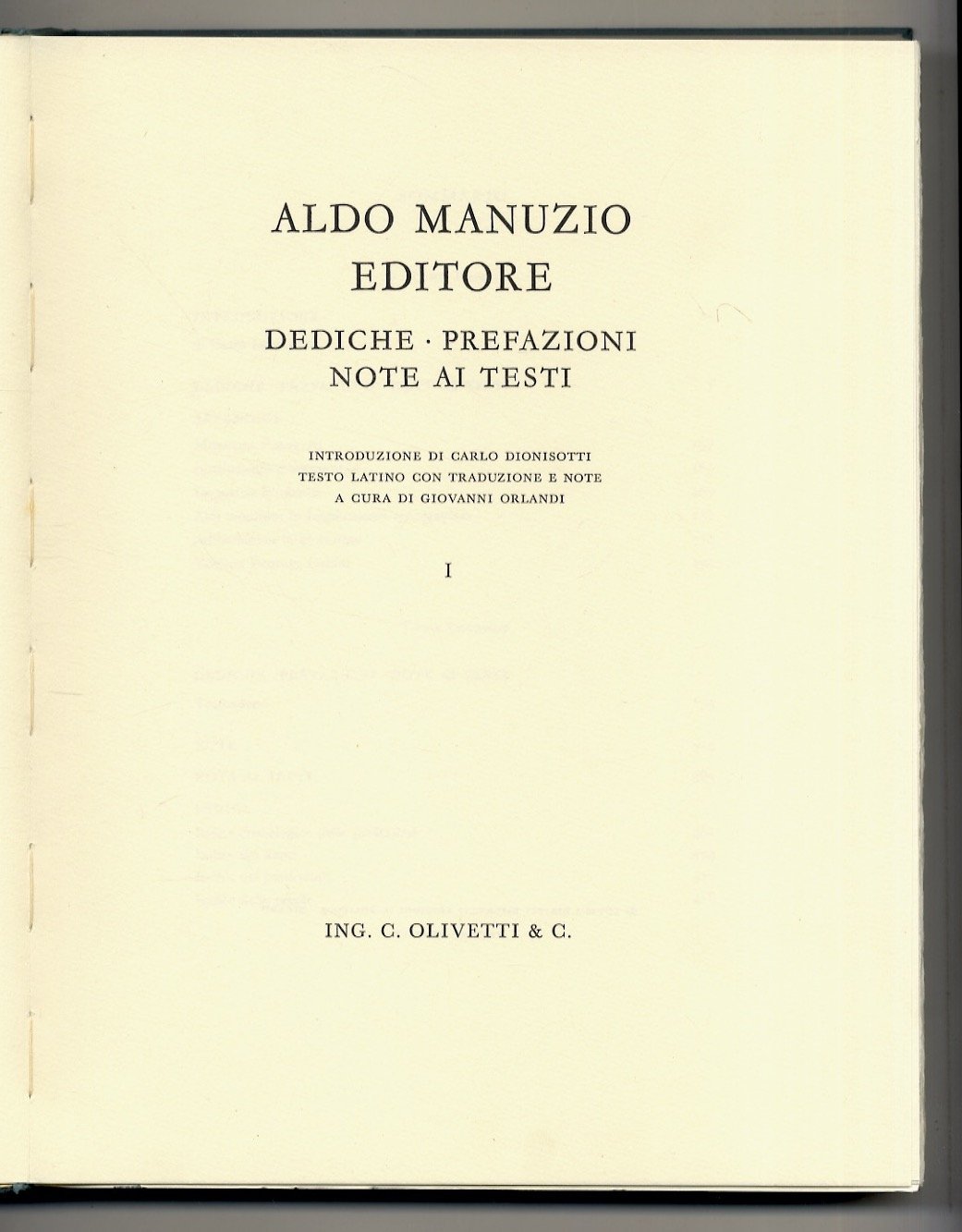 ALDO Manuzio editore. Dediche, prefazioni, note ai testi. Introduzione di Carlo Dionisotti. Testo latino con traduzione e note a cura di Giovanni Orlandi. Vol. I [- vol. II].