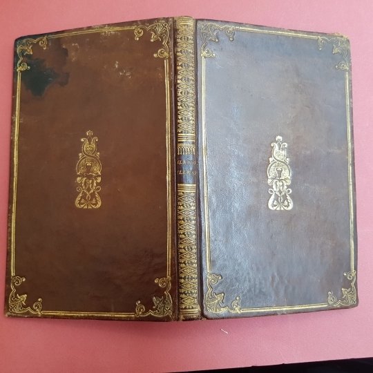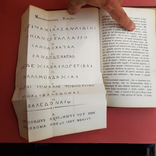 In-8°, pp. 83, (5), una tavola f.t. rip. di antiche iscrizioni, bella e pregiata legatura in piena pelle, ricchi fregi e titolo in oro al dorso, ai piatti cornice a motivi geometrici con al centro rosone inciso in oro con motivi geometrici e fitoformi, tagli in oro. Leggere usure agli angoli, macchia all'angolo superiore esterno del piatto anteriore. Ottimo esemplare in splendida legatura coeva. Raro.