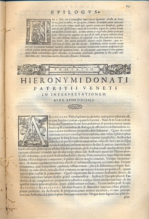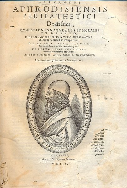 Alexandri Aphrodisiensis Peripathetici Doctissimi, quaestiones naturales et morales et de fato, Hieronymo Bagolino veronensi Patre, & Ioanne Baptista filio interpretibus. De anima, liber primus, Hieronymo Donato patritio Veneto interprete: De anima, liber secundus una cum commentario de Mistione, Angelo Caninio Anglariensi interprete.