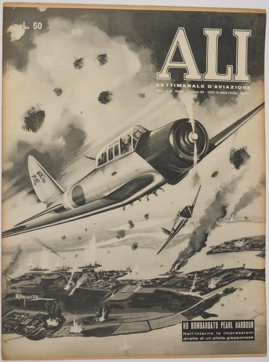 In folio. Dim. 40x30,5 cm. Pp. da 248 a 258+(4). Numero del 11 settembre 1951 della rivista settimanale "Ali" di aviazione."Ali" il periodico degli aviatori italiani nasce a Milano il 28 Marzo 1944 per essere pubblicato fino al 28 Aprile 1945 quando si interruppe a causa della guerra. Riappare nel 1951 fino al 1977 variando più volte di nome. Tra gli articoli presenti: ho bombardato Pearl Harbour, Il battello radiocomandato cala dal cielo, Le ali dell'anima di Fiume, Un Koblet di 30 anni fa ha costruito alianti, Roehn, Alianti in alta quota sulle Alpi, una cicogna sul Gran Sasso ecc. Numerose notizie di attualità e foto d'epoca all'interno. In buone condizioni. Copertina editoriale in buone condizioni generali con lievi usure ai margini e dorso. Piegatura orizzontale. Legatura quasi assente. All'interno le pagine si presentano in ottime condizioni con rare fioriture.Number of the 11th of september 1951 of the weekly magazine "Ali" of aviation. "Ali" the magazine of italian aviators was born in Milan the 28th of March 1944 to be published until the 28th of April 1945 when it was blocked due to the war. It reappeared in 1951 until 1977 changing names different times. Between the issues treated: I have bombed Pearl Harbour, Airplanes in Fiume, A Koblet of 30 years old built airplanes, Roehn, in Alps, Gran Sasso ecc. Different information of actuality and photoes inside. In good conditions. Editorial cover in good general conditions slightly worn in the edges and spine. Binding is almost missing. Inside pages are in very good conditions with occasional foxings.