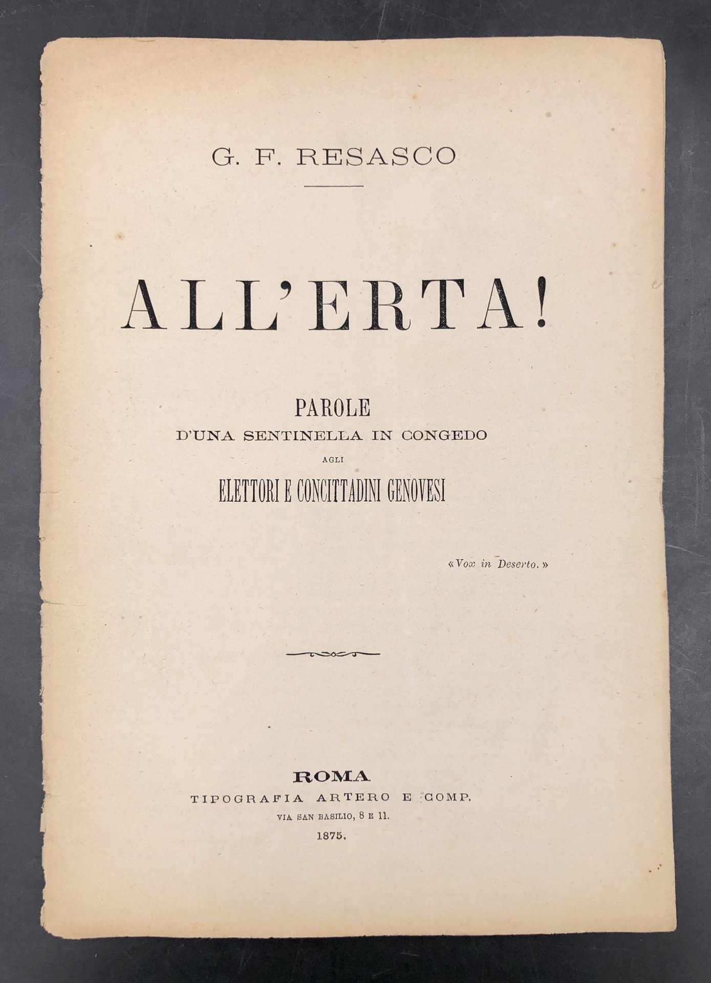 Opuscolo in-8° (cm. 23,3x16,3), pp. 24 inclusi i piatti. Brossura editoriale, usure al dorso. RESASCO, giornalista e scrittore genovese Resasco era figlio del celebre architetto Giovanni Battista (Genova 1798-1871) collaboratore di Carlo Barabino, che portò a compimento il progetto del monumentale Cimitero di Staglieno a Genova. Autore del principale testo ottocentesco su Staglieno, più volte aggiornato: La Necropoli di Staglieno. Opera storica descrittiva-anedottica, Genova, 1892. Direttore di numerose testate: «Il Caffaro», «La Platea», «Il progressista», «Il Progresso», «Lo Specchio», «La voce libera», «La voce pubblica», «L'elettrico parlamentare», e "L'Avanguardia. Giornale politico - amministrativo". Collaborò ai quotidiani: «La Borsa», «Il Movimento» e «Il secolo XIX». Organizzò eventi teatrali e fu direttore del Teatro Carlo Felice di Genova.