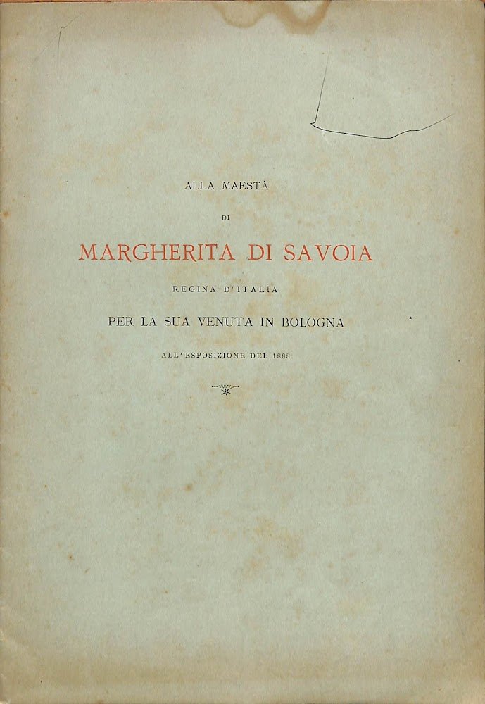 Alla maestà di Margherita di Savoia, regina d'Italia : per la sua venuta in Bologna all'esposizione del 1888 : [versi]. [3] c. ; 24 cm. 851 LOC - Ba Buono (Good)