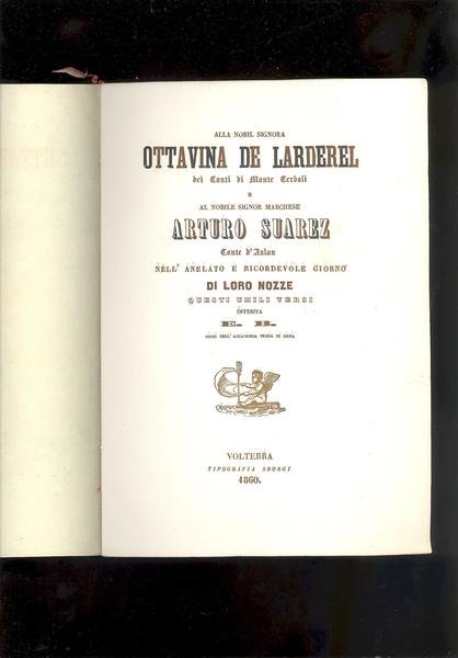 IN 8°, pp.12, COPERTINA EDITORIALE IN BROSSURA VERDE CON TITOLO ENTRO CORNICE.<BR>TITOLO COMPLETO : ALLA NOBILE OTTAVINA DE LARDEREL DEI CONTI DI MONTE CERBOLI<BR>E AL NOBILE SIGNOR MARCHESE ARTURO SUAREZ CONTE D'AULAN NELL'ANELATO E RICORDEVOLE GIORNO DI LORO NOZZE QUESTI UMILI VERSI OFFERIVA - E. B. - SOCIO DELL'ACCADEMIA TEGEA DI SIENA. OTTIMA CONSERVAZIONE. MANTENUTO IL CORDONCINO IN SETA ORIGINALE.ID 3554