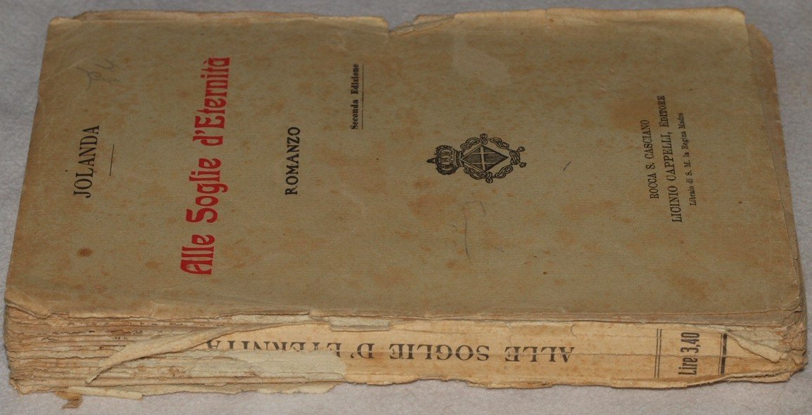 In 8. Dim. 19,5x13 cm. Pp. 265. Edizione del 1917 di questa opera completa di Jolanda (1864-1917). Il romanzo venne pubblicato per la prima volta nel 1902. L'opera è in un volume ed è completa. Brossura editoriale originale. Brossura editoriale in mediocri condizioni generali con usure e parti mancanti ai margini e dorso. Piatti staccati. Legatura quasi assente. All'interno le pagine si presentano in buone condizioni con rare fioriture. Usure ai margini. Edition of 1917 of this complete work by Jolanda (1864-1917). The novel was published for the first time in 1902. The work is in one volume and it is compelte. Editorial original cover. Editorial cover in poor general conditions with wearings and missing parts in the edges and spine. Plates are detached. Binding is almost missing. Inside pages are in good conditions with occasional foxings. Worn edges.