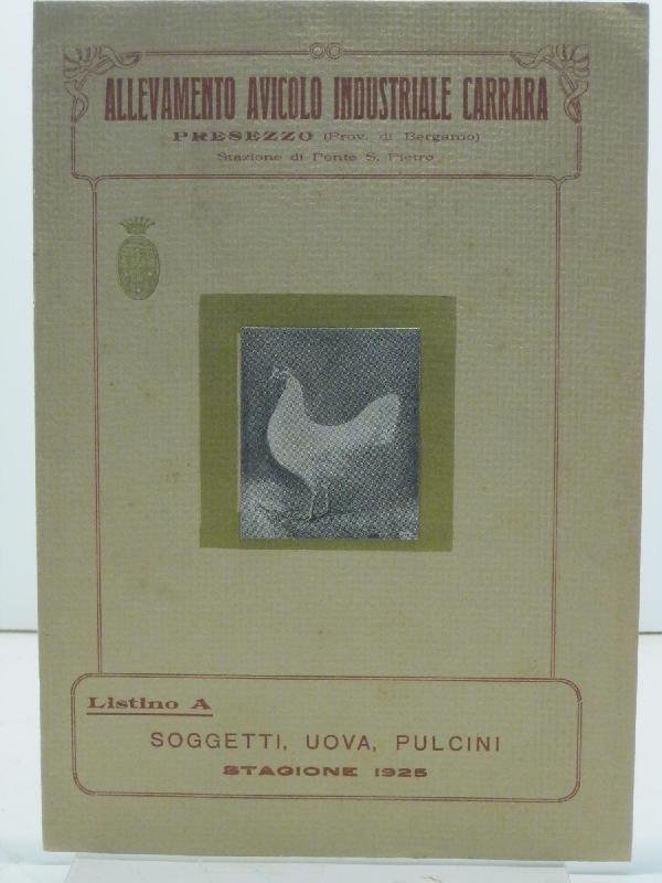 In 8, pp.11, con ill. fotografiche all'interno. Br. ed. Catalogo raffigurante cinque tipologie di pollame in vendita ( Livorno Bianca, Wyandotte Bianca, ecc.). All'interno anche i  listini dei prezzi delle uova e del pollame nella stagione 1925.