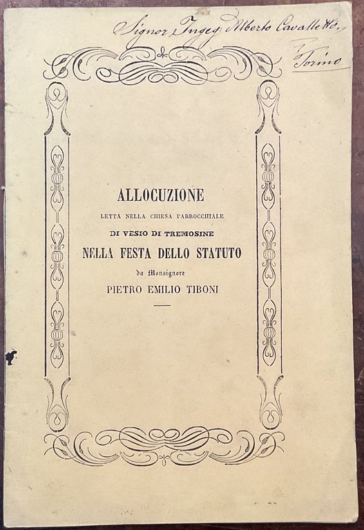 Allocuzione letta nella chiesa parrocchiale di Vesio di Tremosine nella Festa dello Statuto da Monsignore Pietro Emilio Tiboni