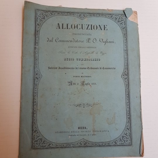Allocuzione pronunciata da Commendatore P. O. Vigliani Avvocato fiscale generale presso la Corte d'Appello di Nizza pel solenne insediamento del nuovo Tribunale di Commercio di Porto Maurizio addi 6 Luglio 1857